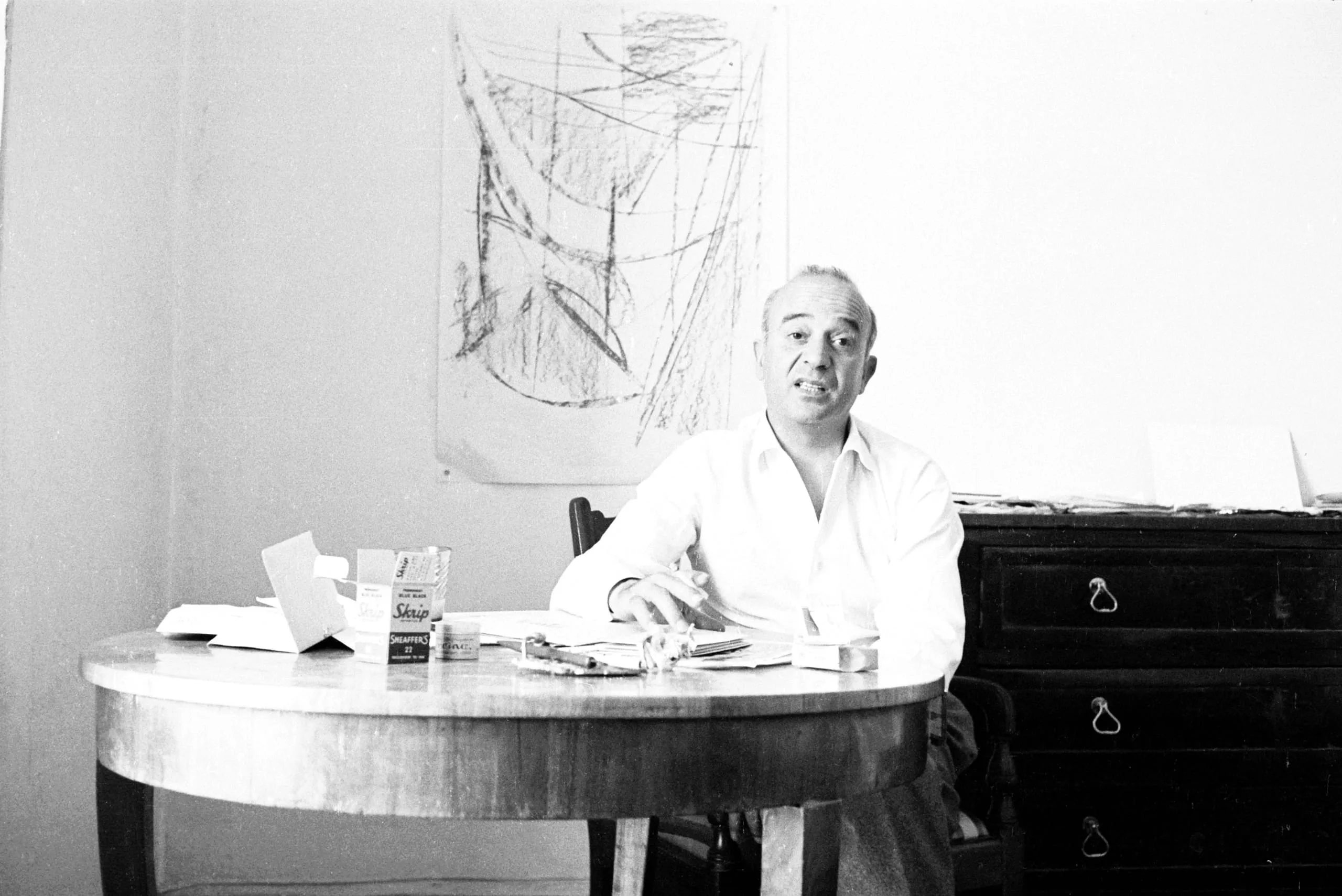 Black and white photograph of a man in a white shirt seated at a round table, with an abstract drawing pinned to the wall behind him