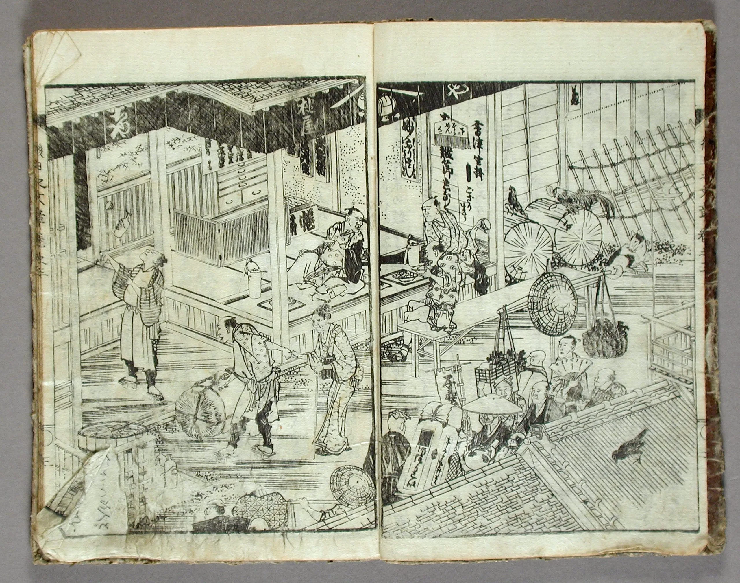 Open Japanese woodblock-printed book, two-page spread with black ink on cream paper depicting a busy street-level market or shop scene with multiple figures, architecture, and Japanese script
