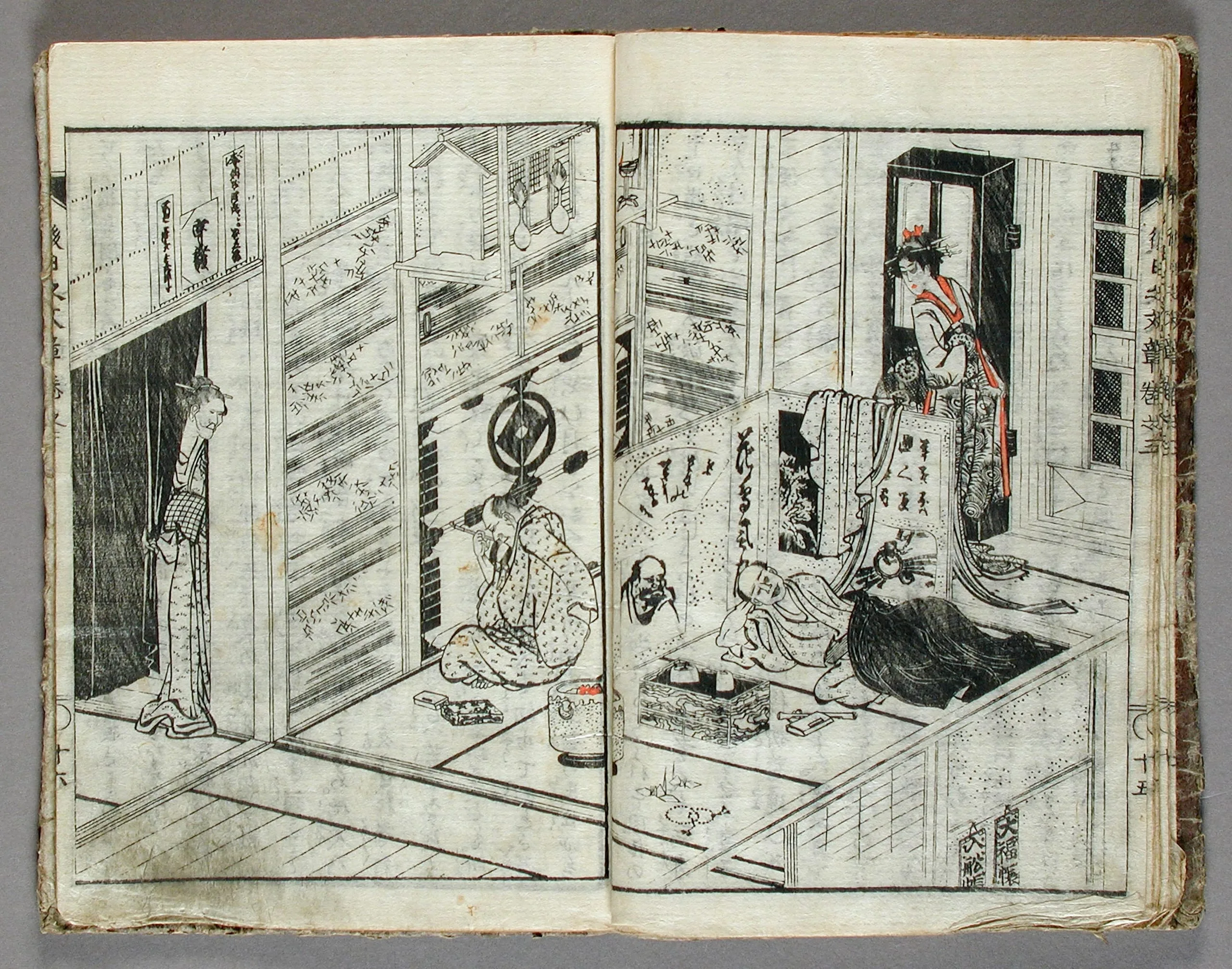 Japanese woodblock-printed book, open to a two-page spread depicting an interior scene with multiple figures in traditional dress; a standing woman in kimono with red accent at upper right, a prostrate figure on a raised platform, a seated figure at center, and another figure at far left near a curtained doorway; Japanese calligraphy and decorative sliding panels throughout.