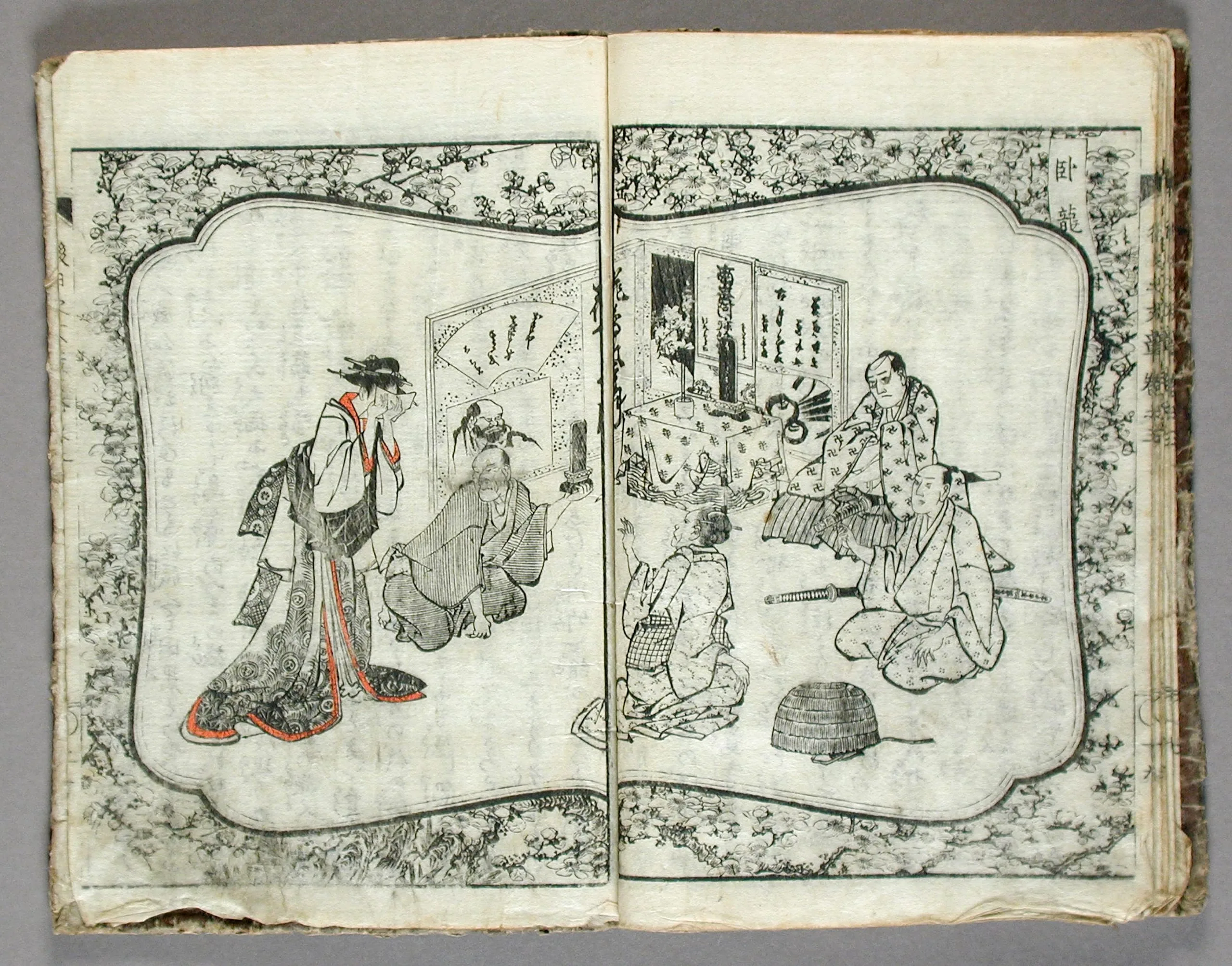 Japanese woodblock-printed book, open spread showing two illustrated pages with floral-patterned borders. Left page depicts a standing woman in layered robes with red collar detail and a kneeling figure before a folding screen with calligraphy. Right page shows several seated and kneeling figures in patterned garments around a lacquered cabinet, with Japanese text columns at upper right.