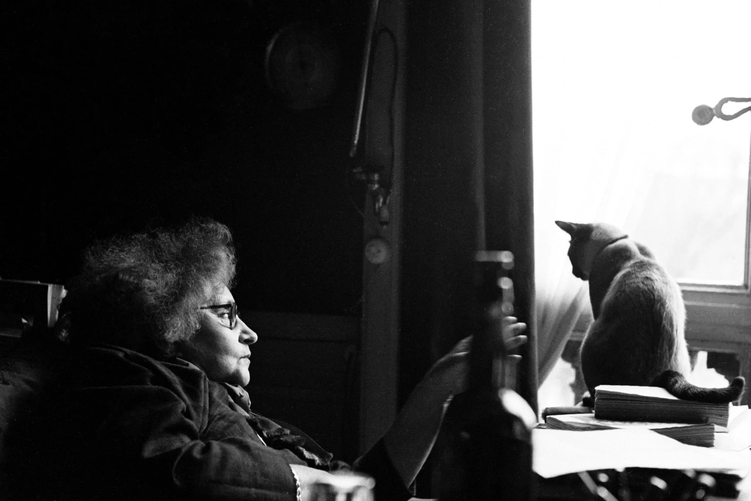 Black and white photograph, older woman in profile emerging from deep shadow on the left, a cat silhouetted against a bright window on the right