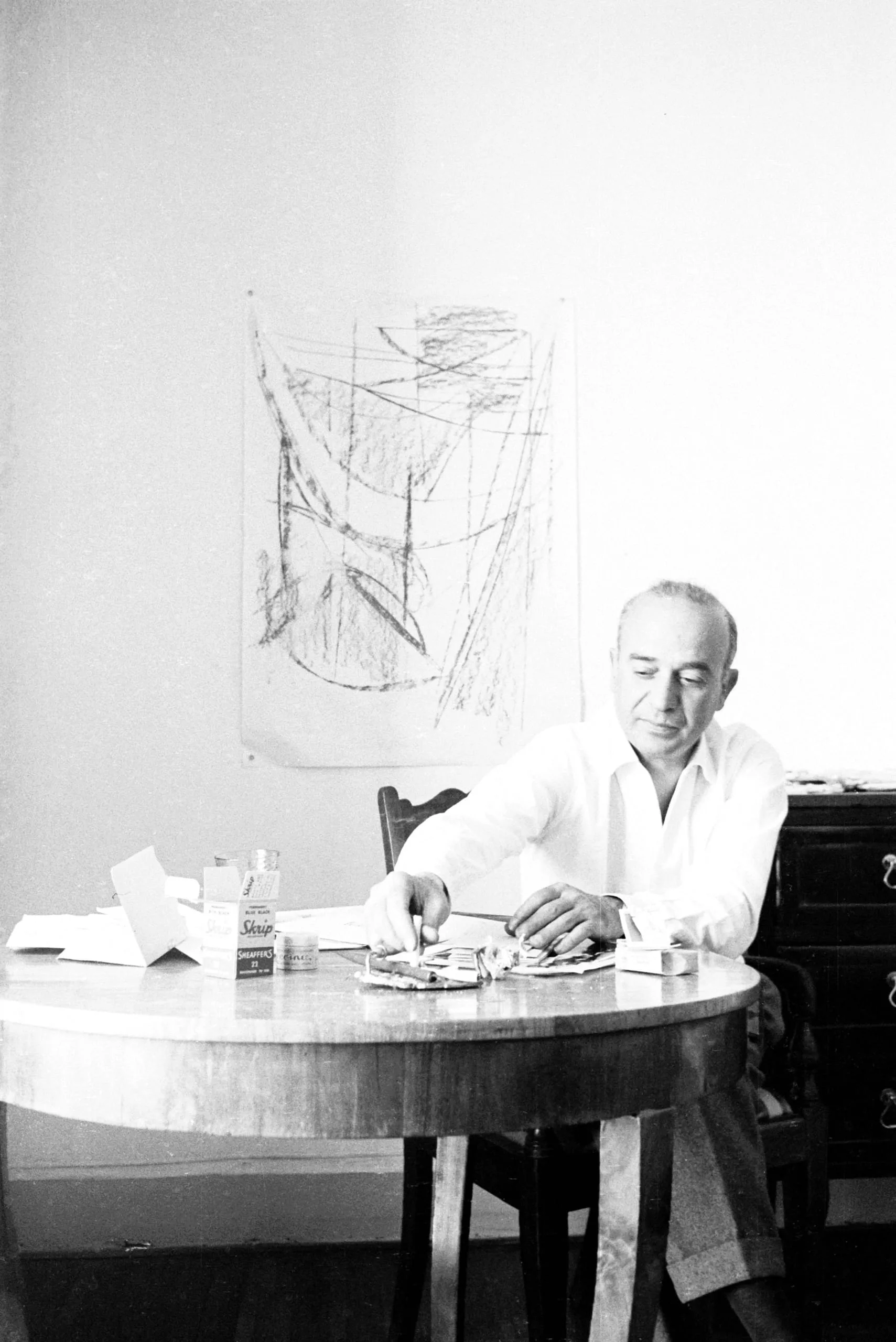 Black and white photograph of a man in a white shirt seated at a round table, head bowed, with an abstract sketch pinned to the wall behind him