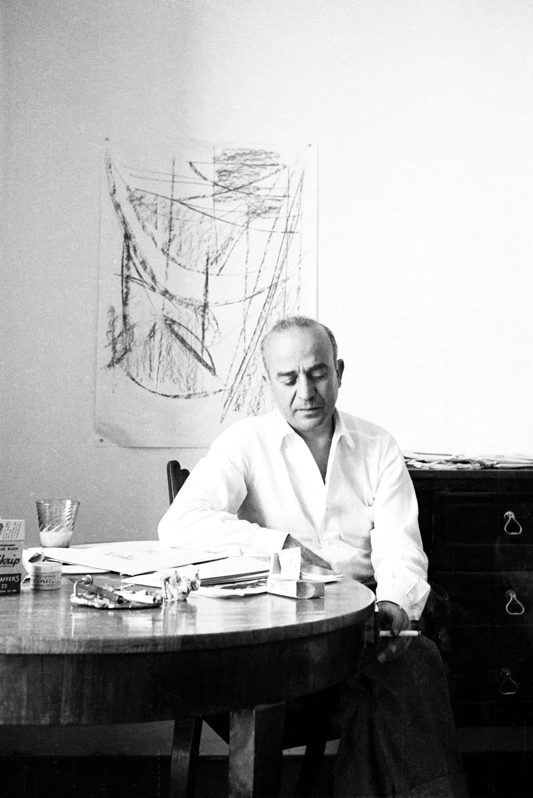 Black and white photograph of a man in a white shirt seated at a round table, looking down, with an abstract sketch pinned to the wall behind him