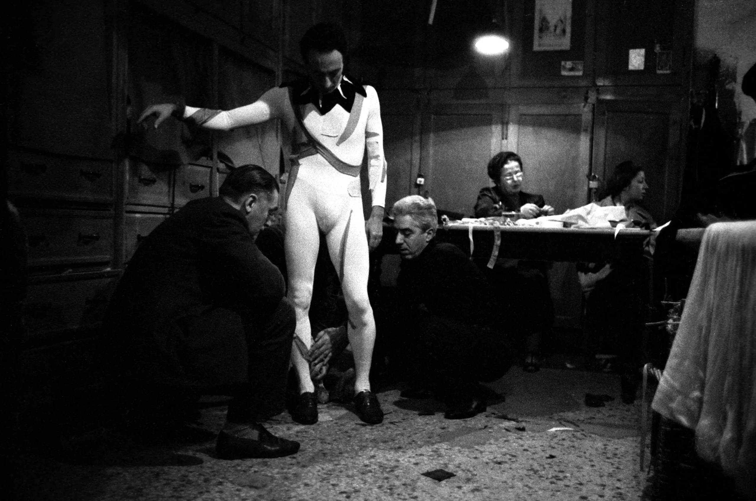 Black and white photograph of a figure in a white bodysuit standing while two men crouch at their feet in a dimly lit room, with two women seated at a table in the background