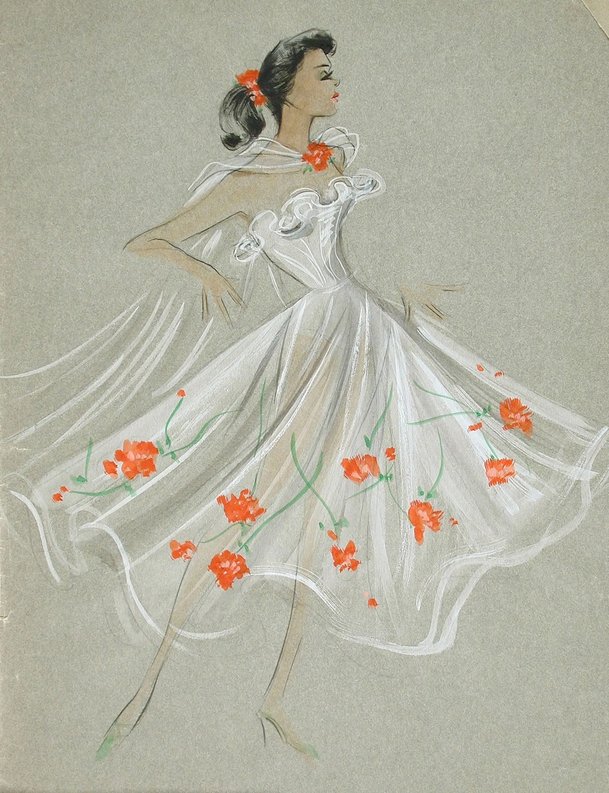 Fashion illustration in gouache and chalk on gray paper, full-length woman in a swirling white off-the-shoulder dress decorated with orange-red flowers and green stems