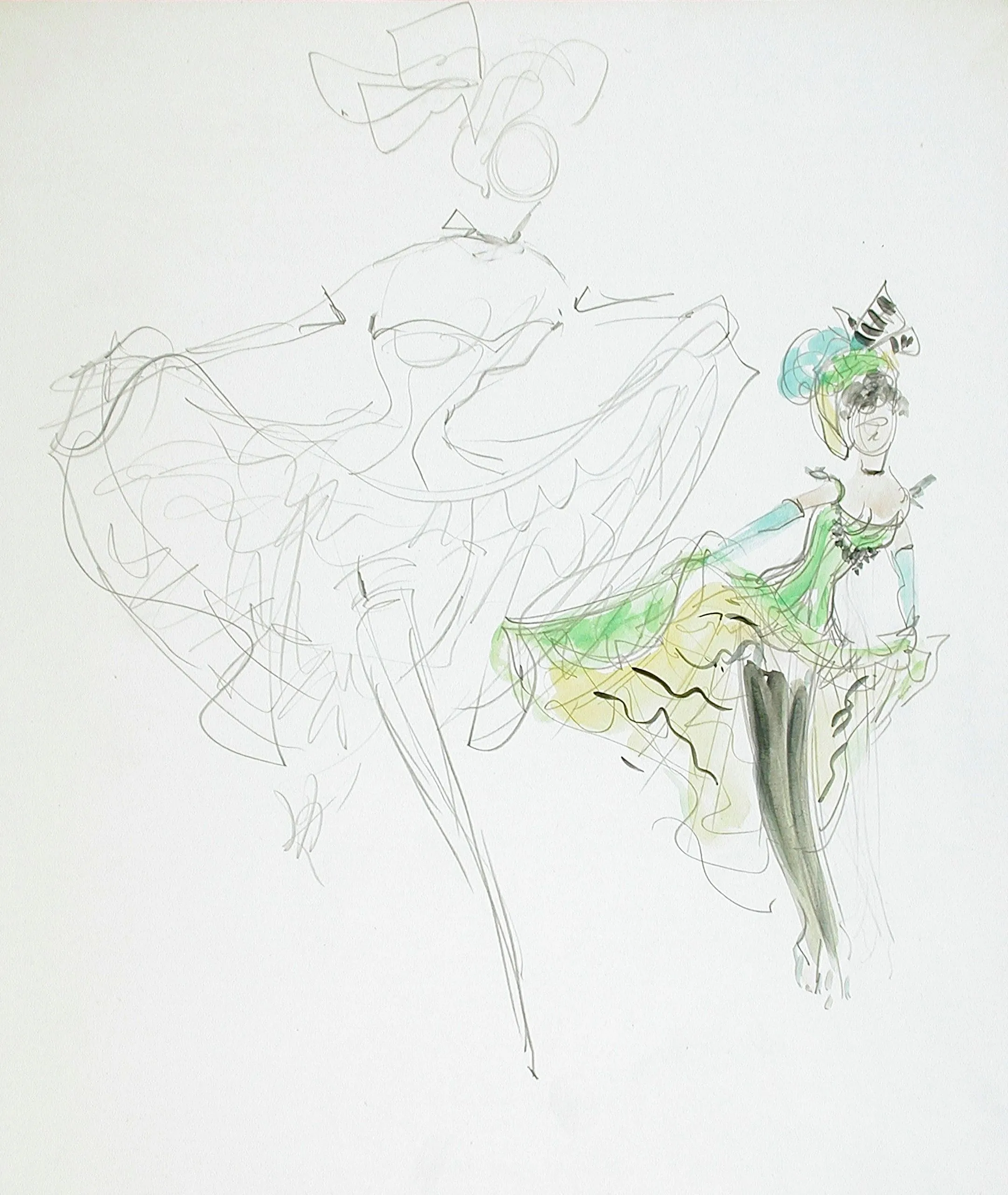 Pencil and watercolor drawing on white paper showing two studies of a dancing female figure, one loose gestural sketch and one colored figure in a ruffled green skirt and top hat
