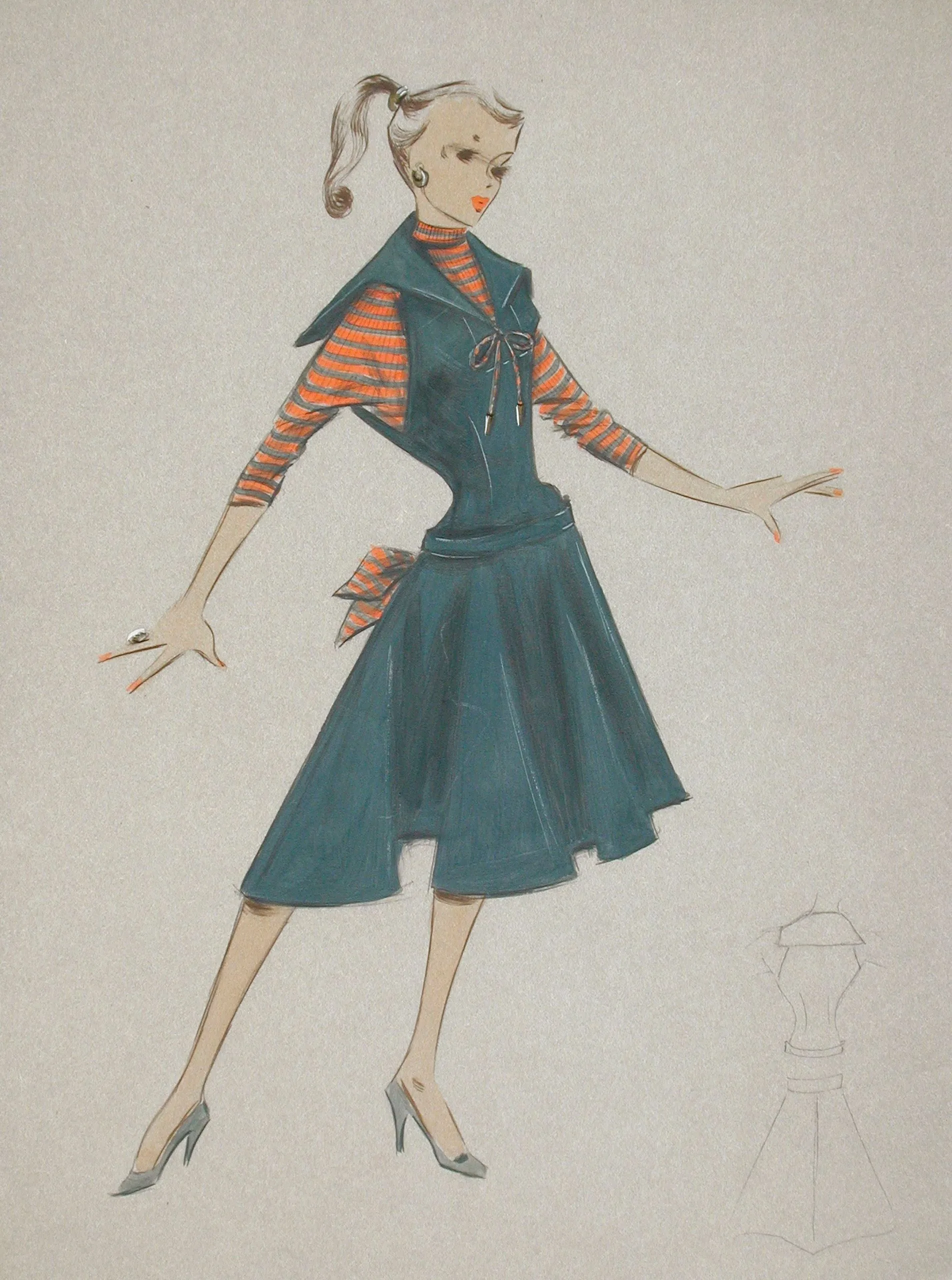 Fashion illustration in ink and gouache on gray-beige paper, full-length stylized female figure in a teal sleeveless dress over an orange-striped turtleneck, with a small hat sketch at lower right