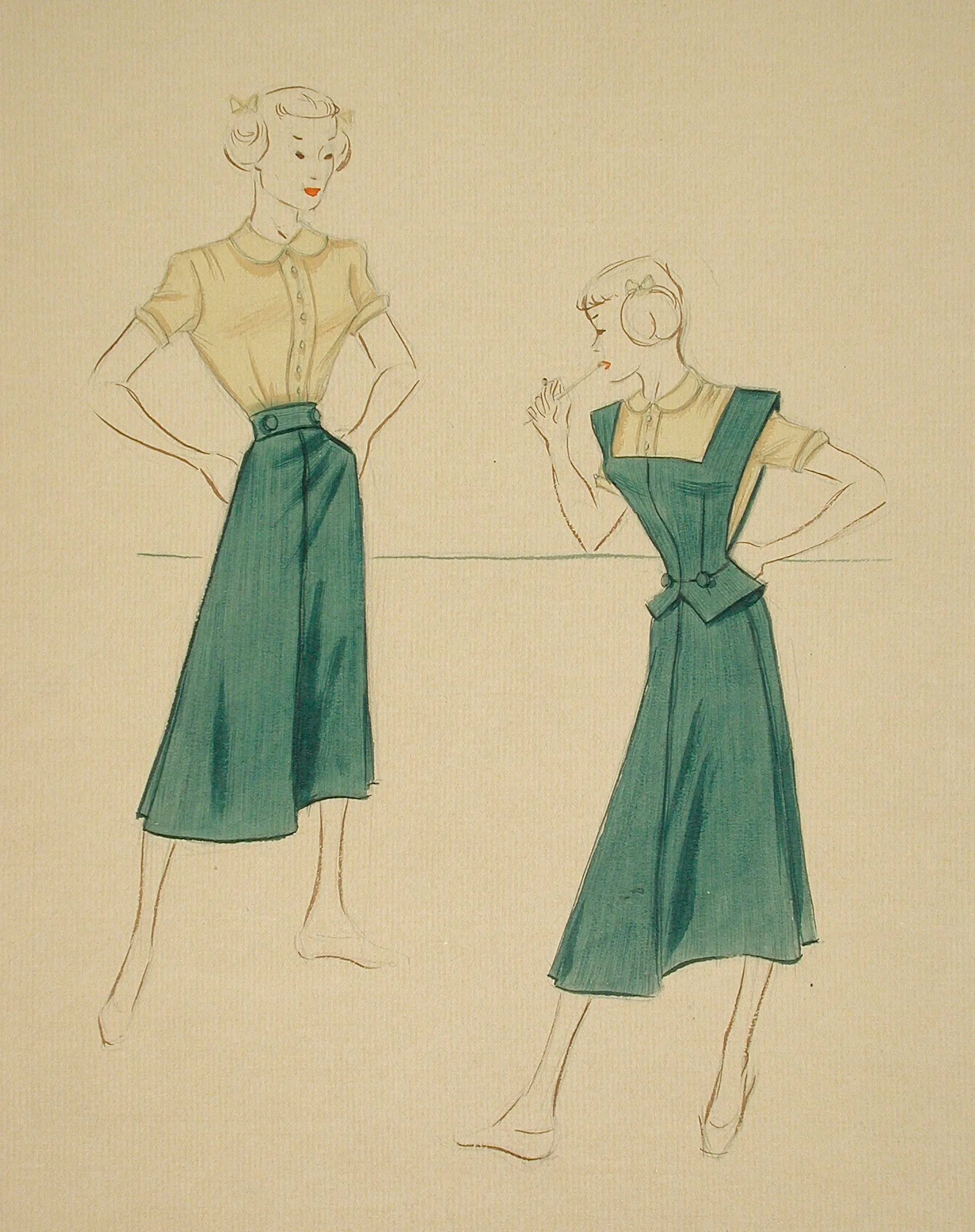 Fashion illustration in ink and watercolor on cream paper, two women in teal skirts and pale yellow blouses, mid-twentieth-century style
