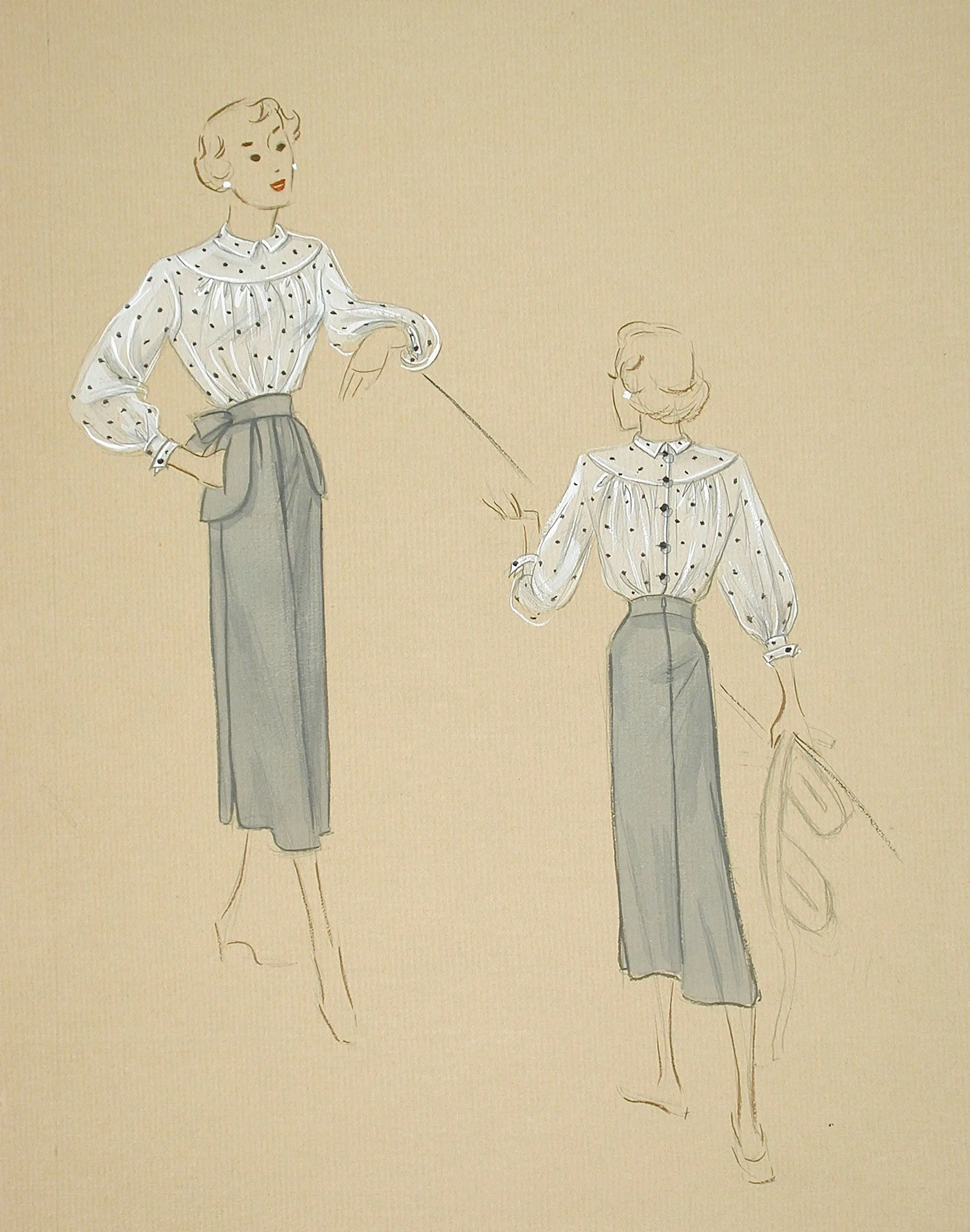 Fashion illustration in ink and watercolor on tan paper, showing front and back views of a woman in a dotted white blouse with rounded yoke and a slim blue-gray skirt