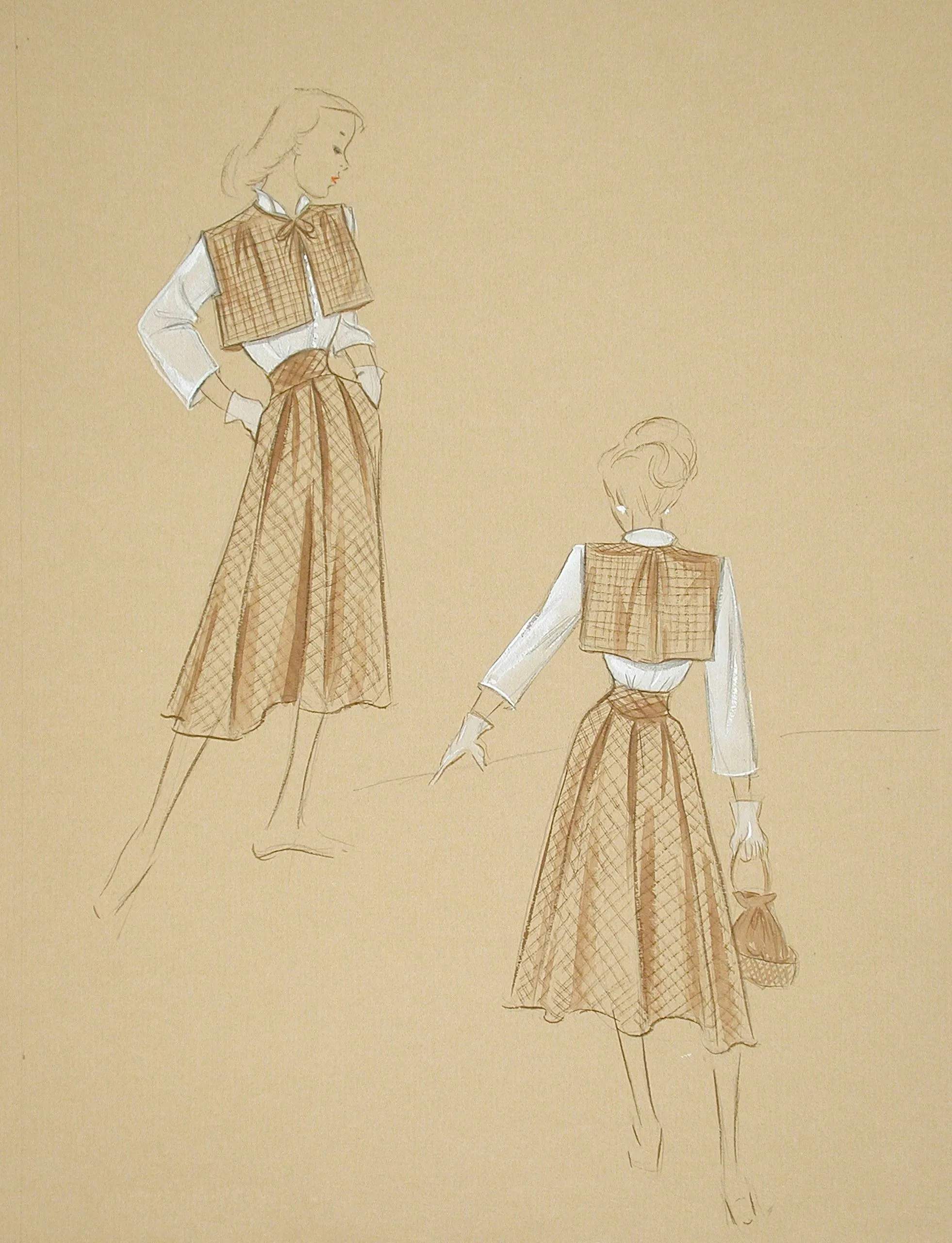 Fashion illustration in brown ink and wash on tan paper, two female figures wearing matching caramel plaid cape-and-skirt outfits shown from front and back views