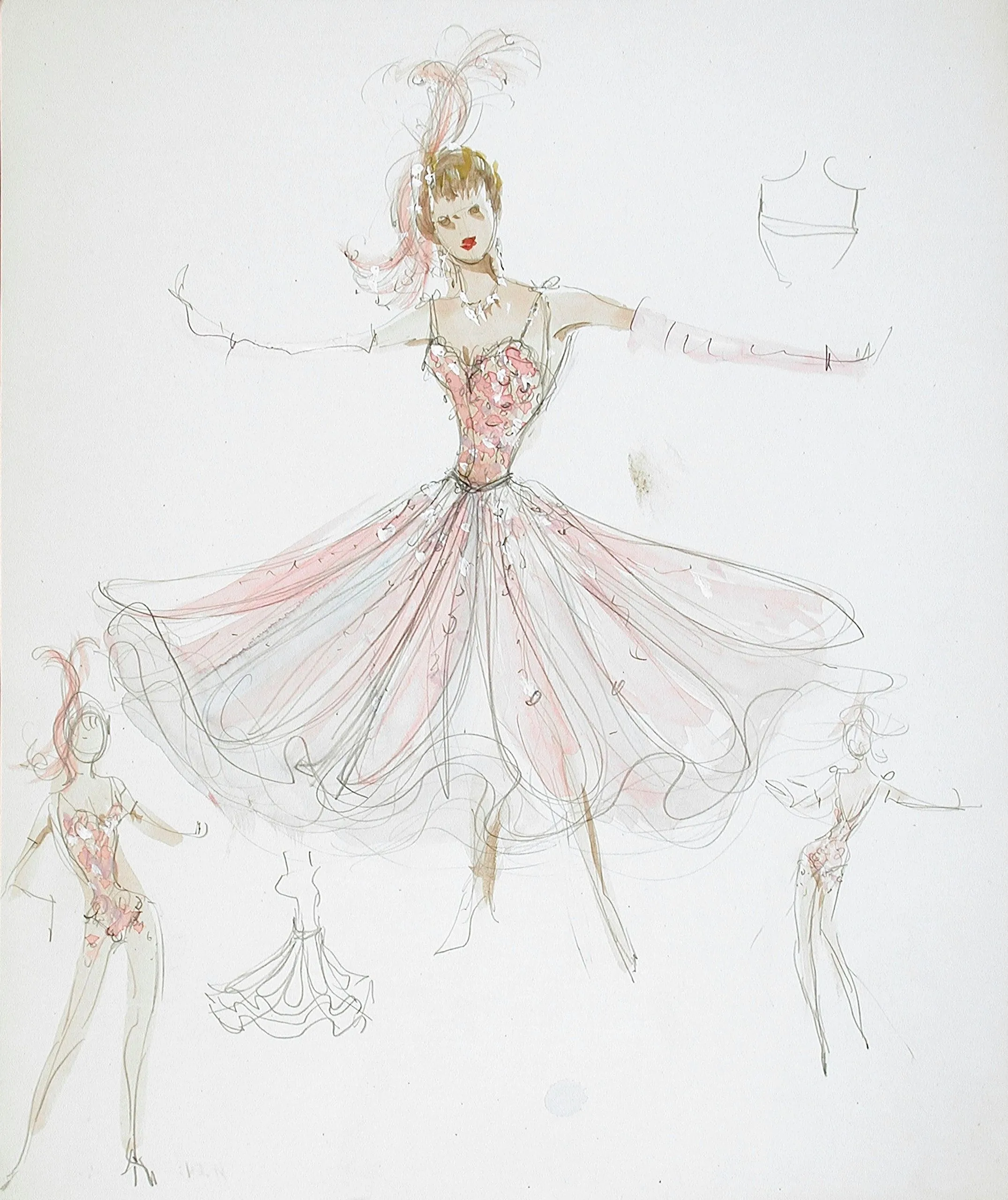 Costume design drawing in ink and pink watercolor wash on off-white paper, central full-length figure in a feathered headdress and floral bodice with billowing skirt, arms outstretched, surrounded by four smaller figure sketches