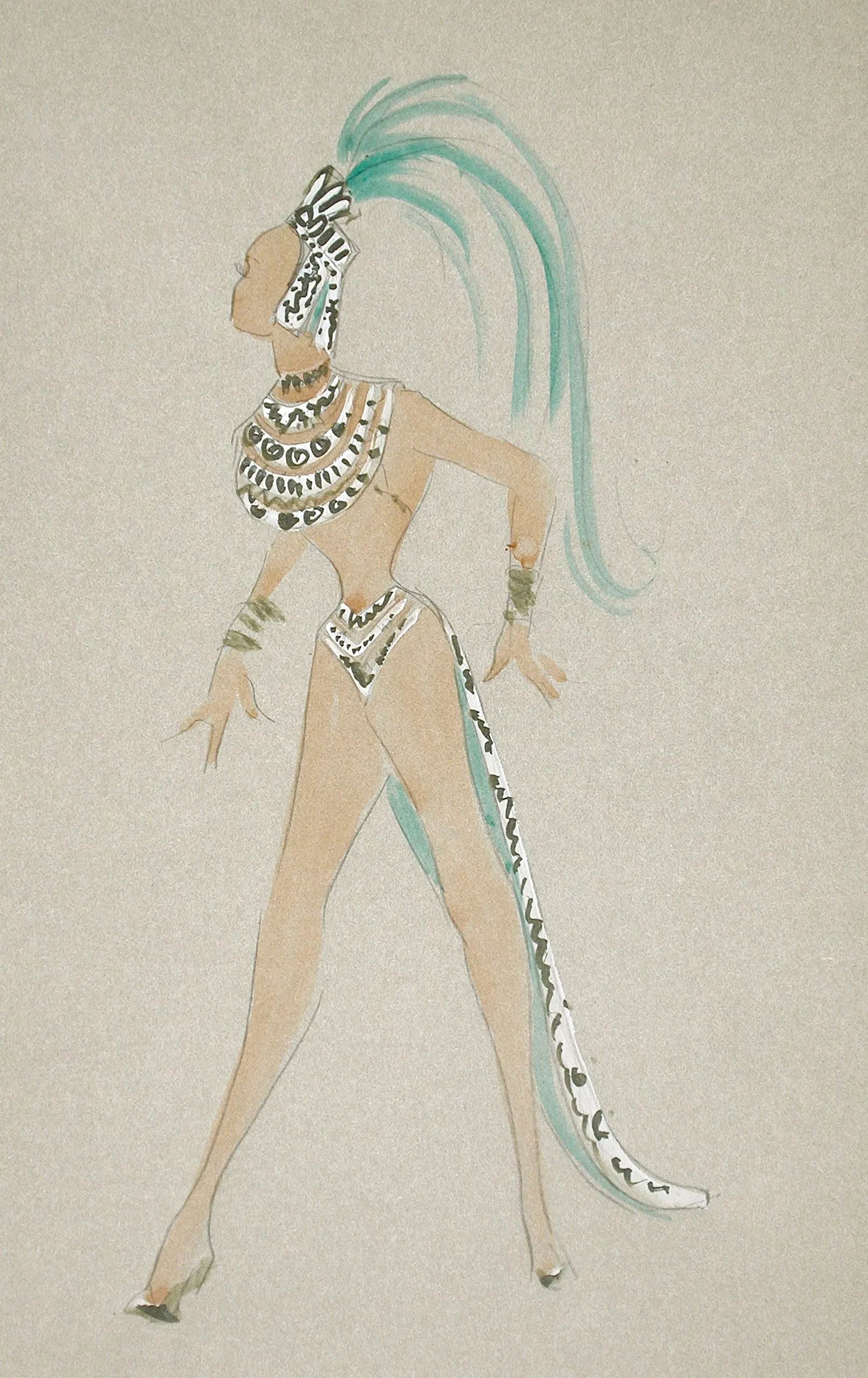 Ink and watercolor costume design drawing on tan paper, full-length female figure in profile wearing a feathered headdress, beaded collar, and geometric accessories with a serpentine train