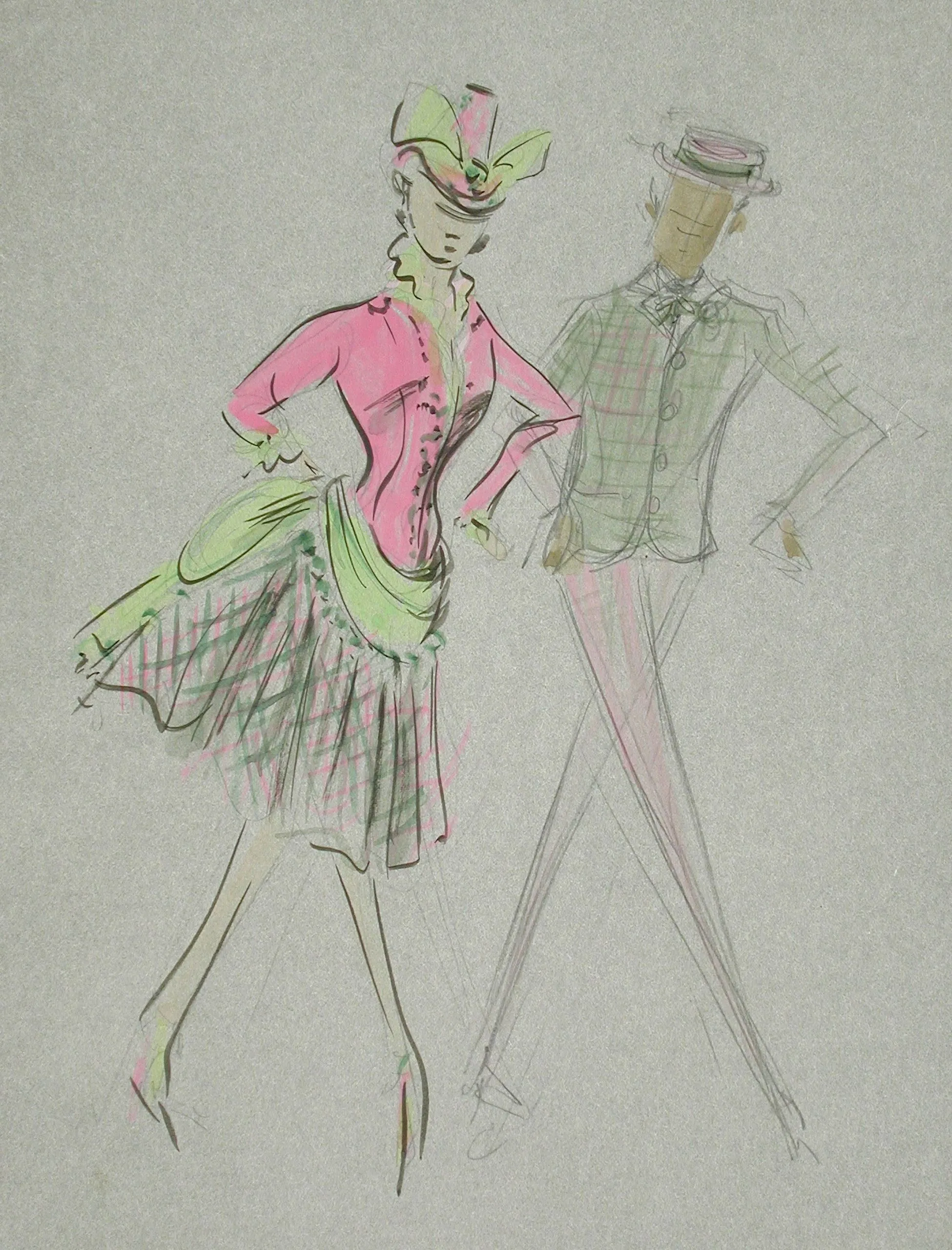 Fashion illustration in ink and pink and green washes on gray paper, showing two stylized figures in plaid coordinating outfits and brimmed hats, rendered with loose gestural lines