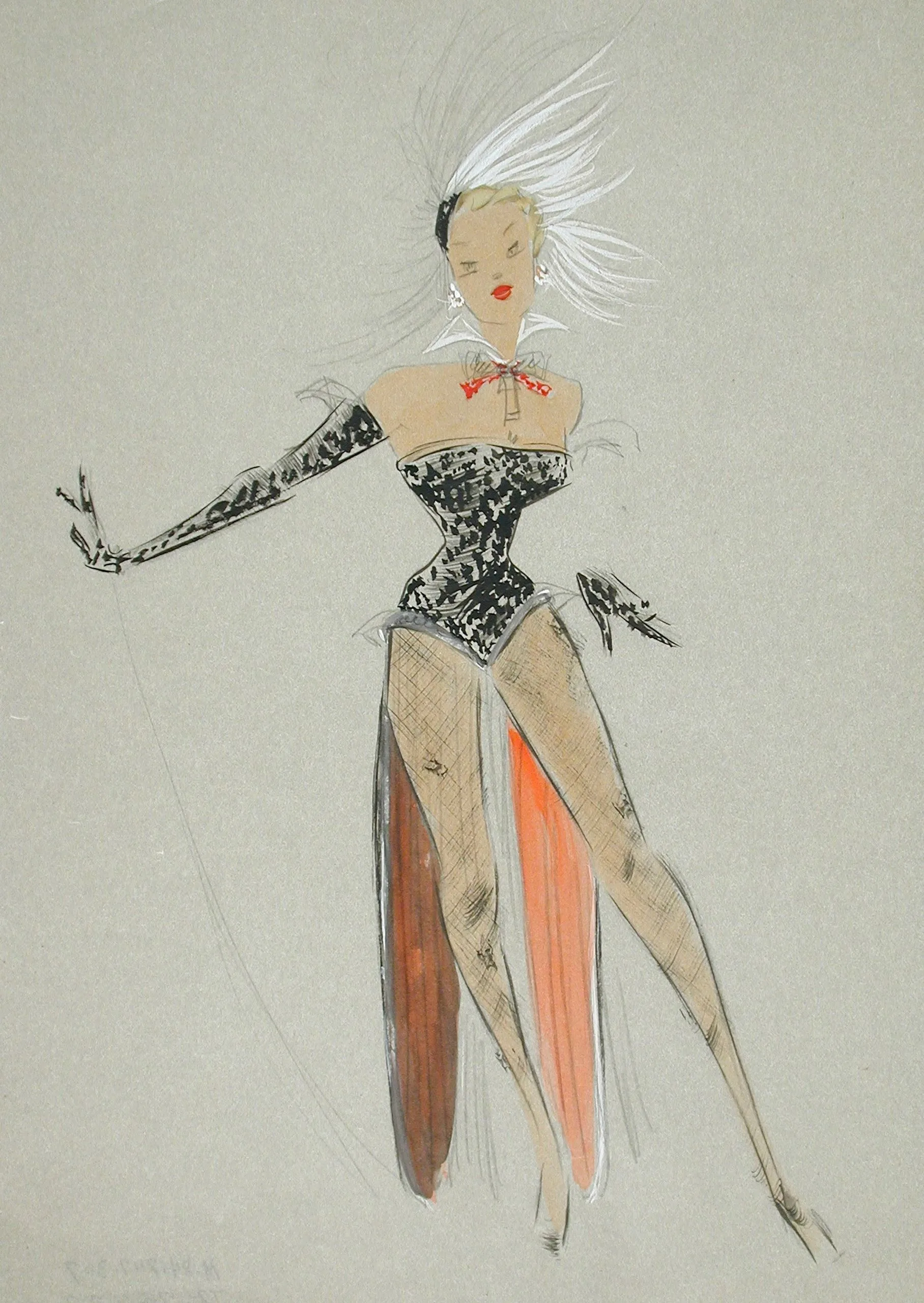 Costume design drawing in pencil, ink, and watercolor on gray paper, full-length female figure in a mottled black-and-white corset and long gloves with coral-orange skirt panels and a sweeping white feathered headdress