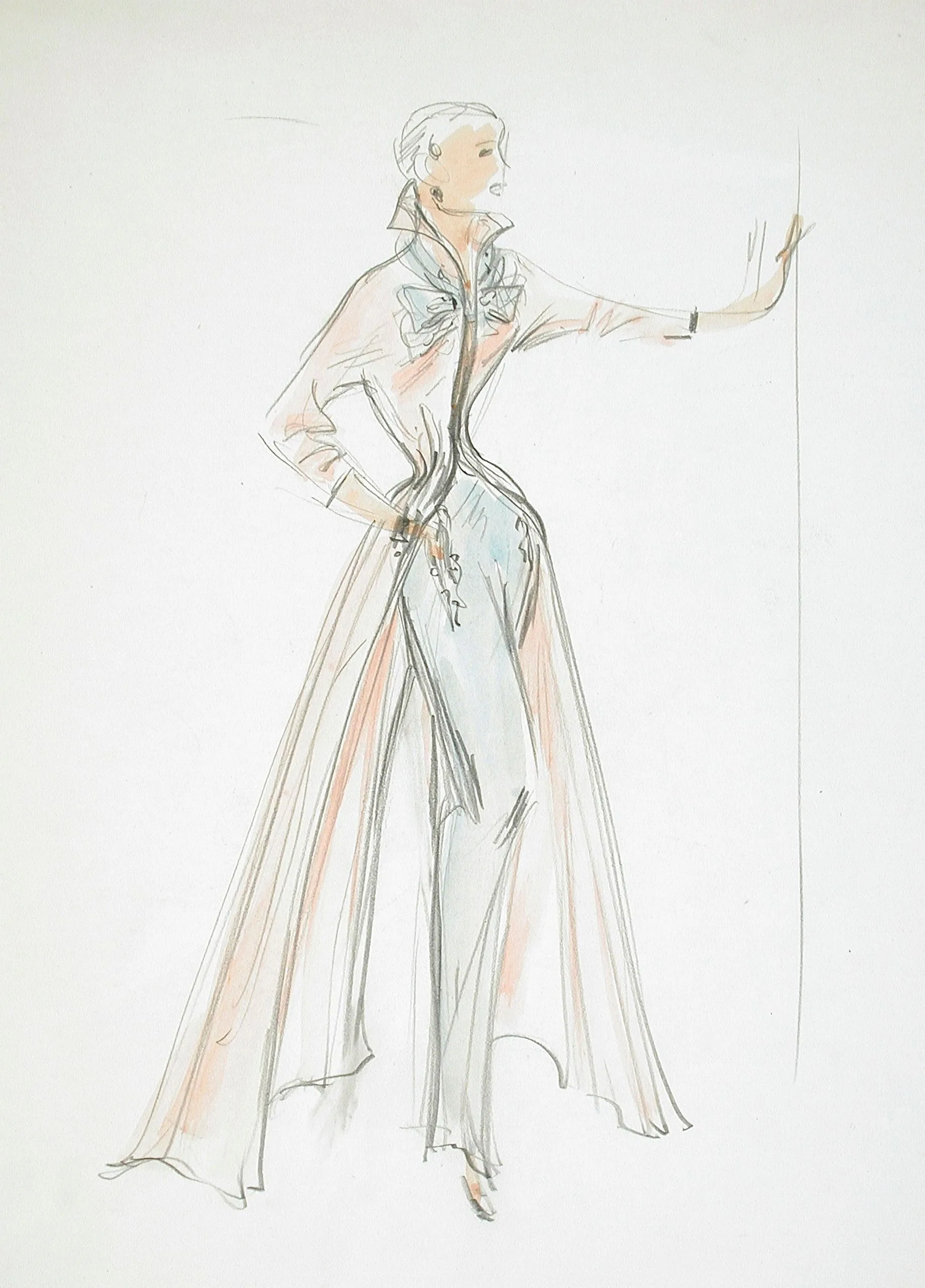 Fashion illustration in graphite and watercolor, full-length figure of a woman in profile wearing a floor-length flared coat with pale pink and blue washes