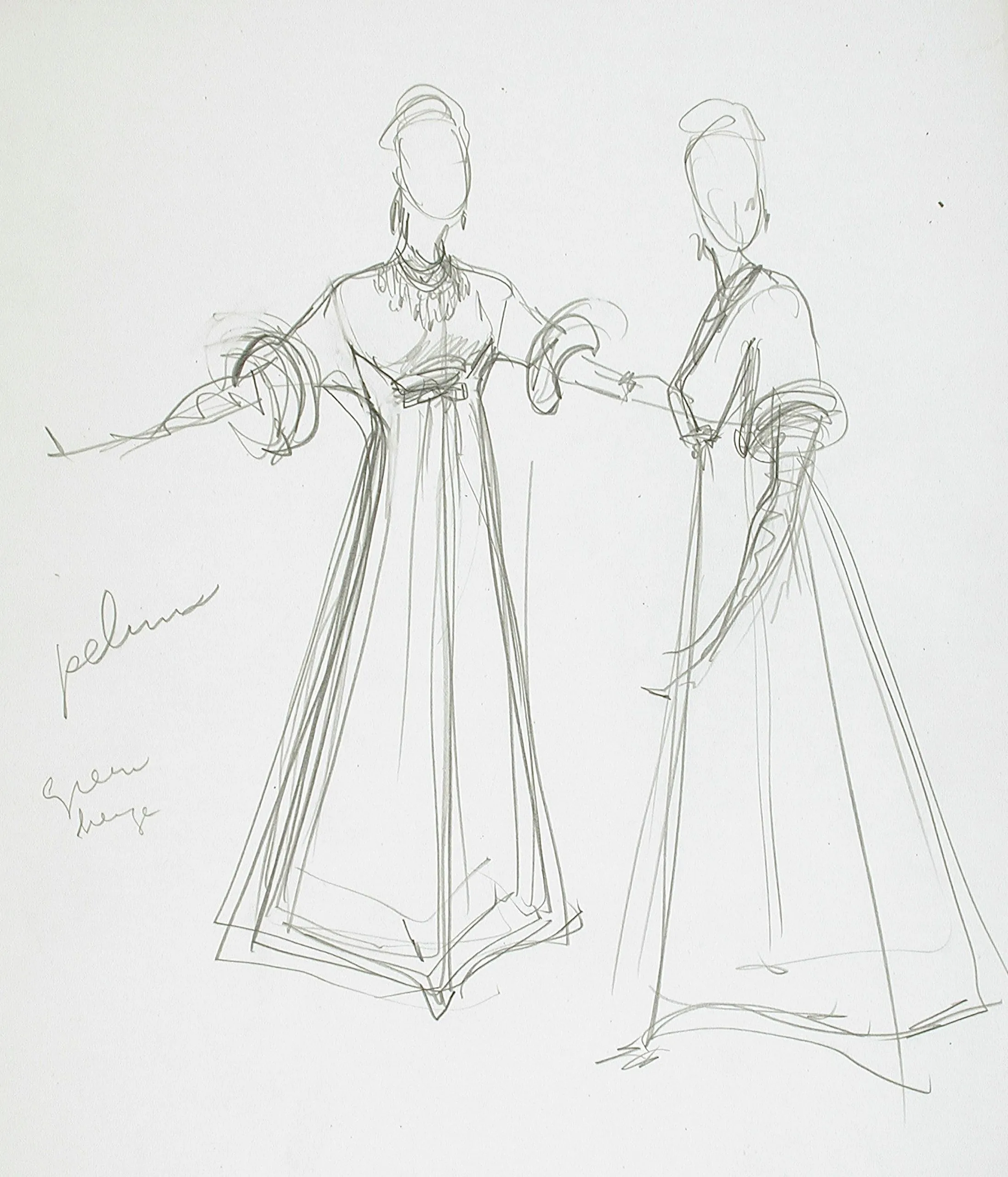 Pencil costume sketch on white paper, two standing female figures in long belted dresses with puffed cuffs, loose gestural linework, with handwritten color annotations