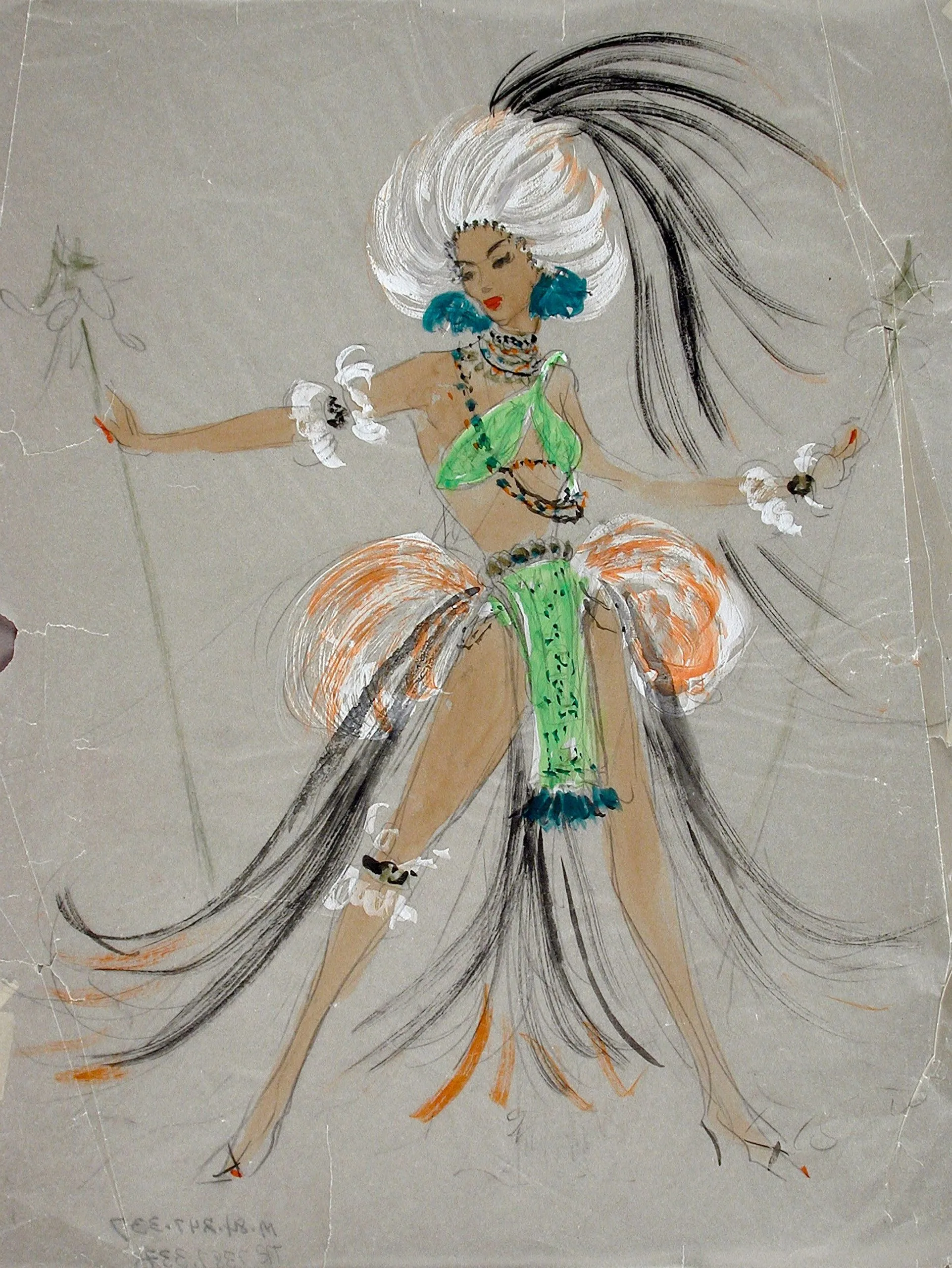 Gouache and chalk drawing on gray paper of a full-length dancer in an elaborate feathered costume with white headdress, green bikini top, and sweeping black and orange plumes