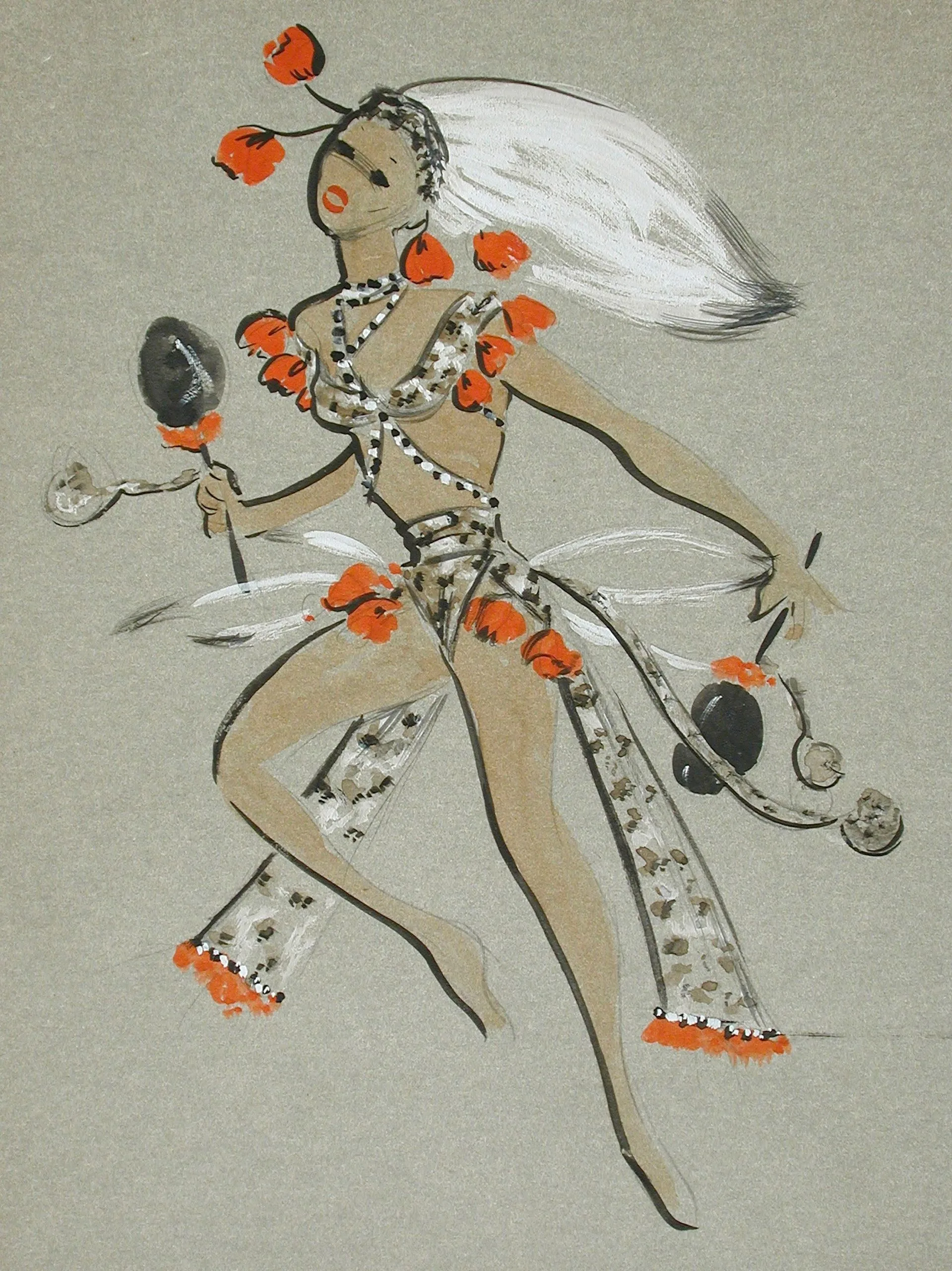 Gouache and ink drawing on gray paper of a dancing figure in a beaded costume with flowing white hair and orange-red floral accents, holding maracas