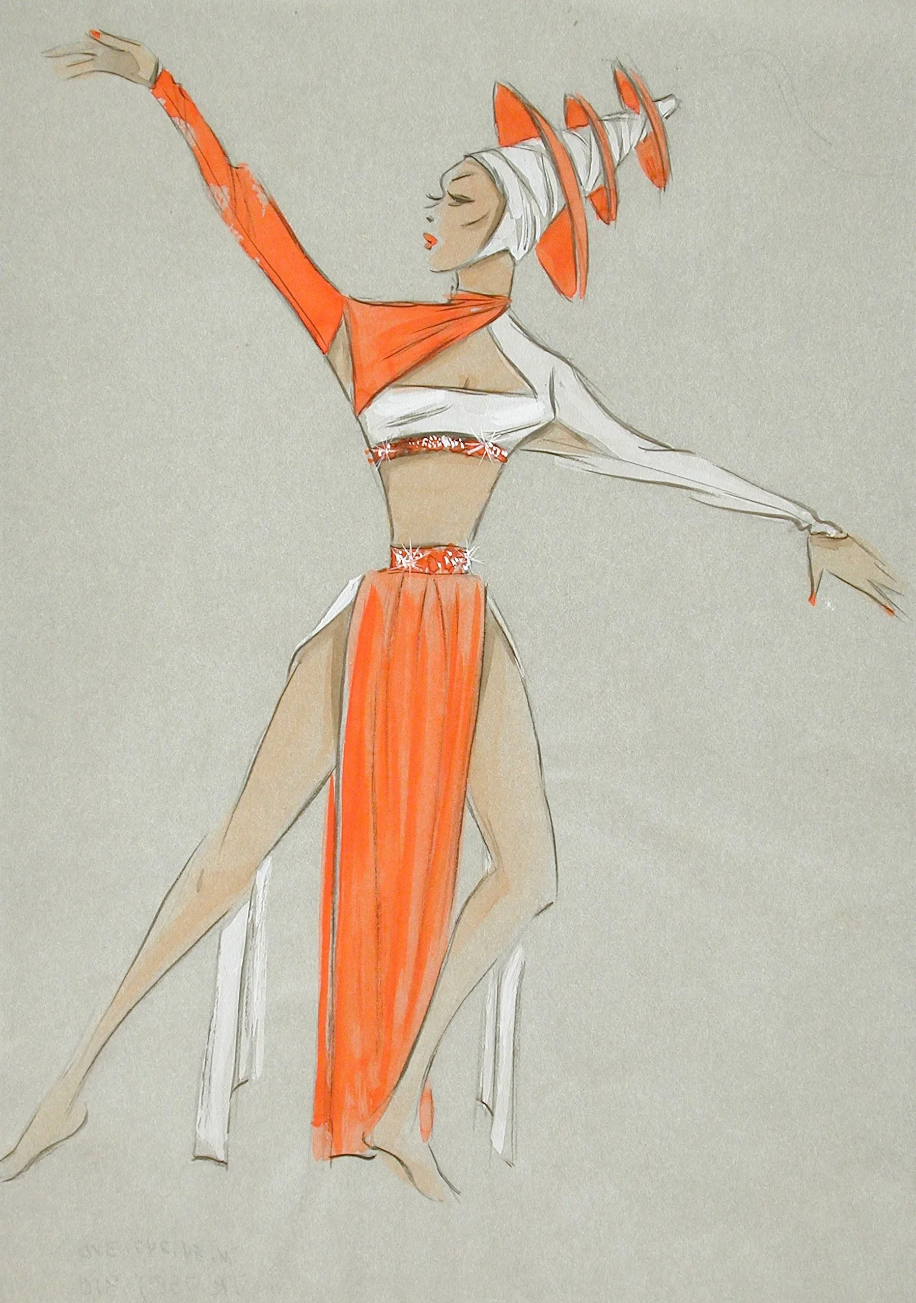 Costume design drawing in pencil, ink, and gouache on gray paper, full-length female figure in a dynamic pose wearing an orange and white theatrical costume with a pointed headdress
