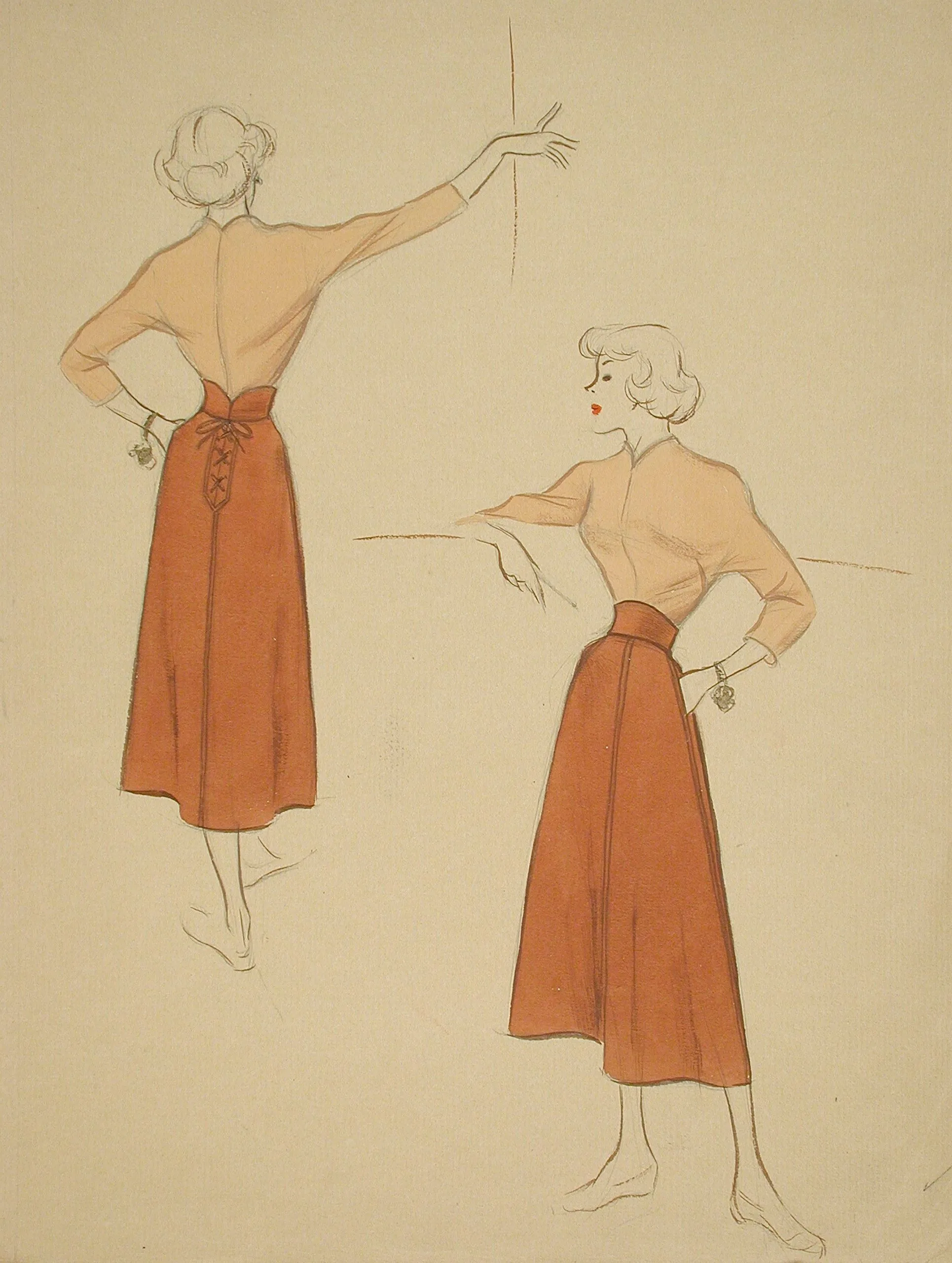 Fashion illustration in ink and wash on cream paper, two views of a woman in a terracotta midi skirt and fitted top, shown from the back and three-quarter front