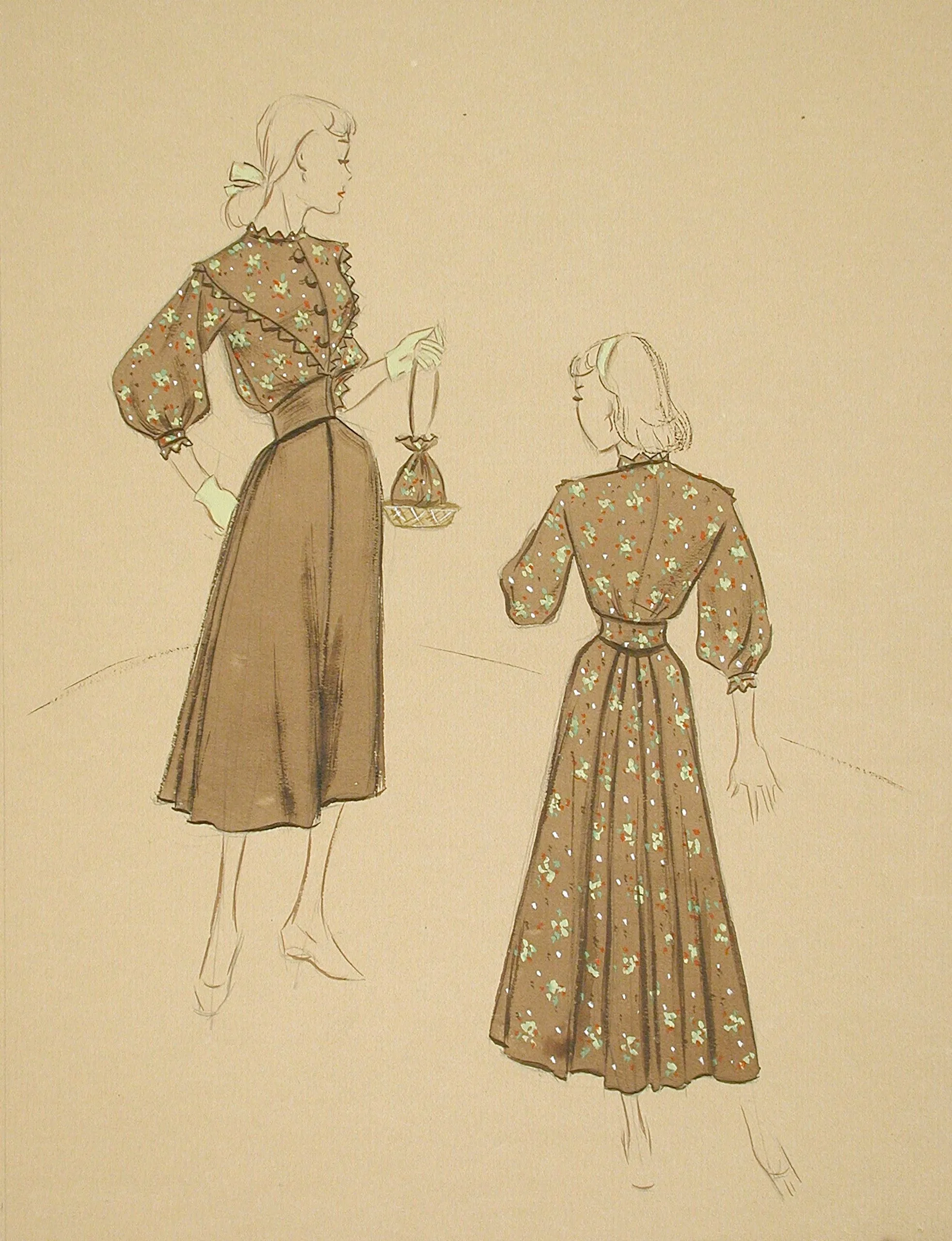Fashion illustration in ink and watercolor on sand-colored paper, two rear views of a woman in a floral blouse and flared skirt, loose gestural lines