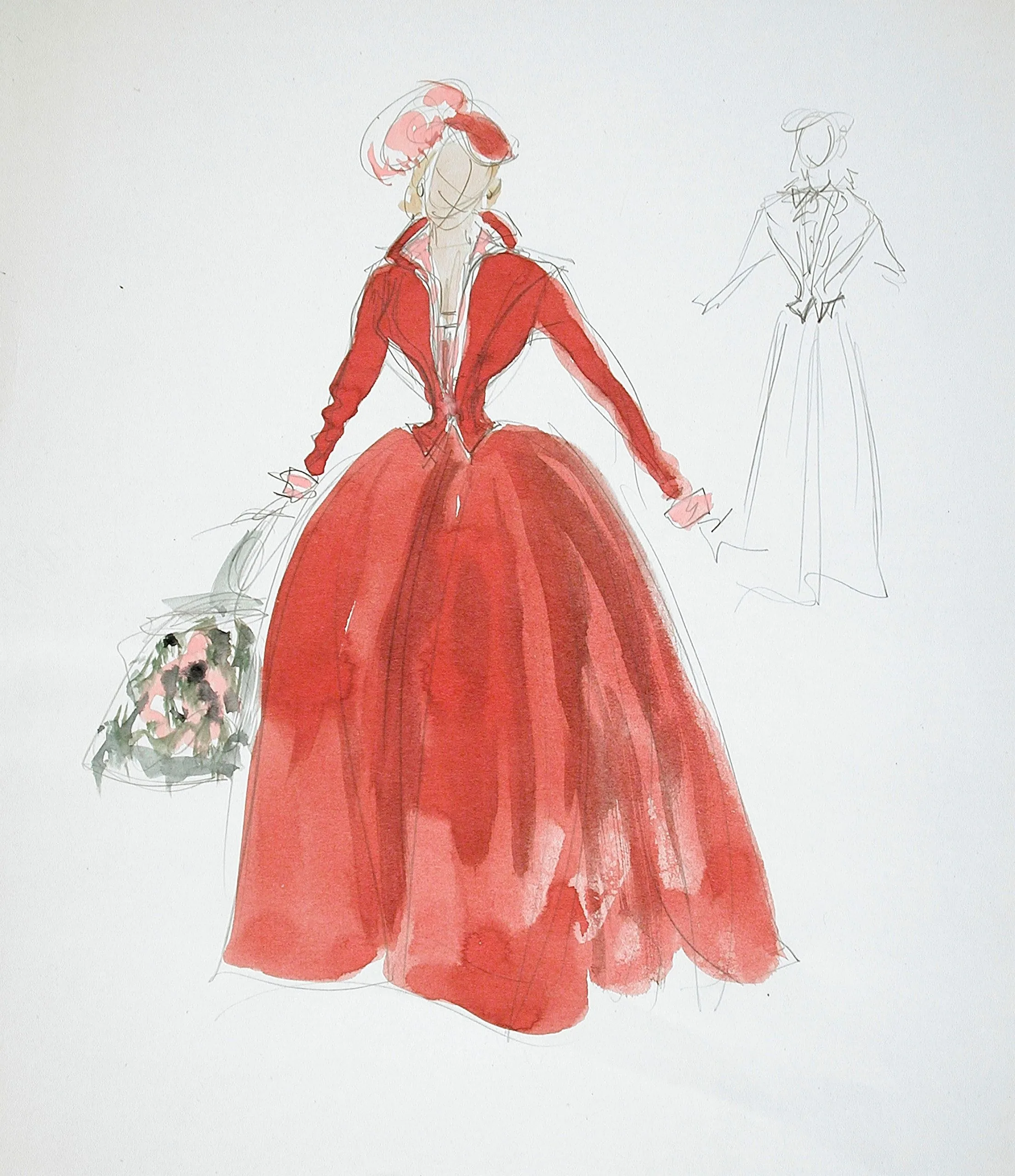 Fashion illustration in watercolor and pencil on white paper, full-length female figure shown from behind in a crimson red ball gown with fitted jacket and voluminous skirt, with a small pencil sketch of the same costume in the upper right