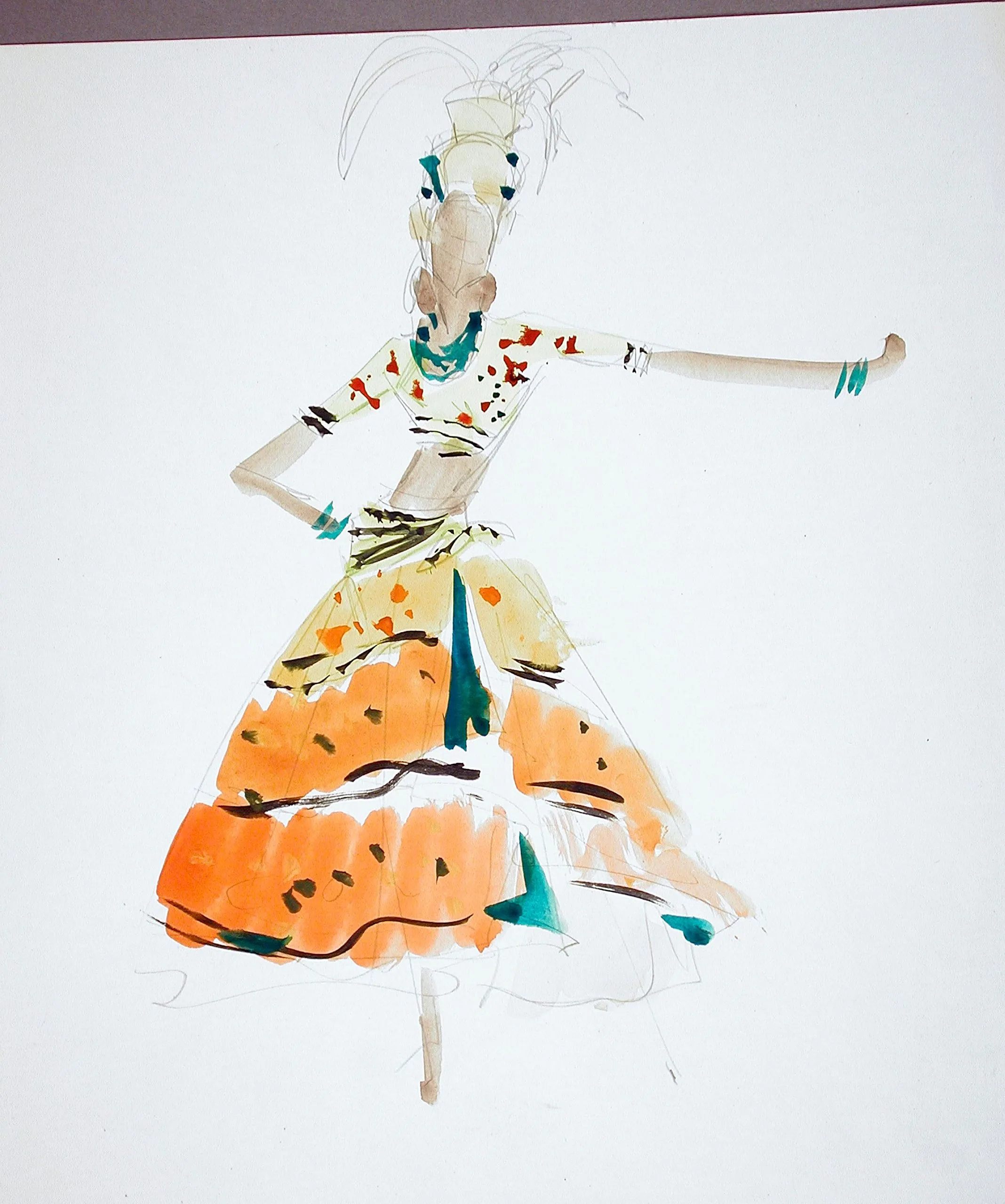 Watercolor and pencil fashion illustration of a full-length female figure in a wide-skirted orange and yellow dress with teal accents and a feathered headdress, rendered in loose, gestural strokes on white paper