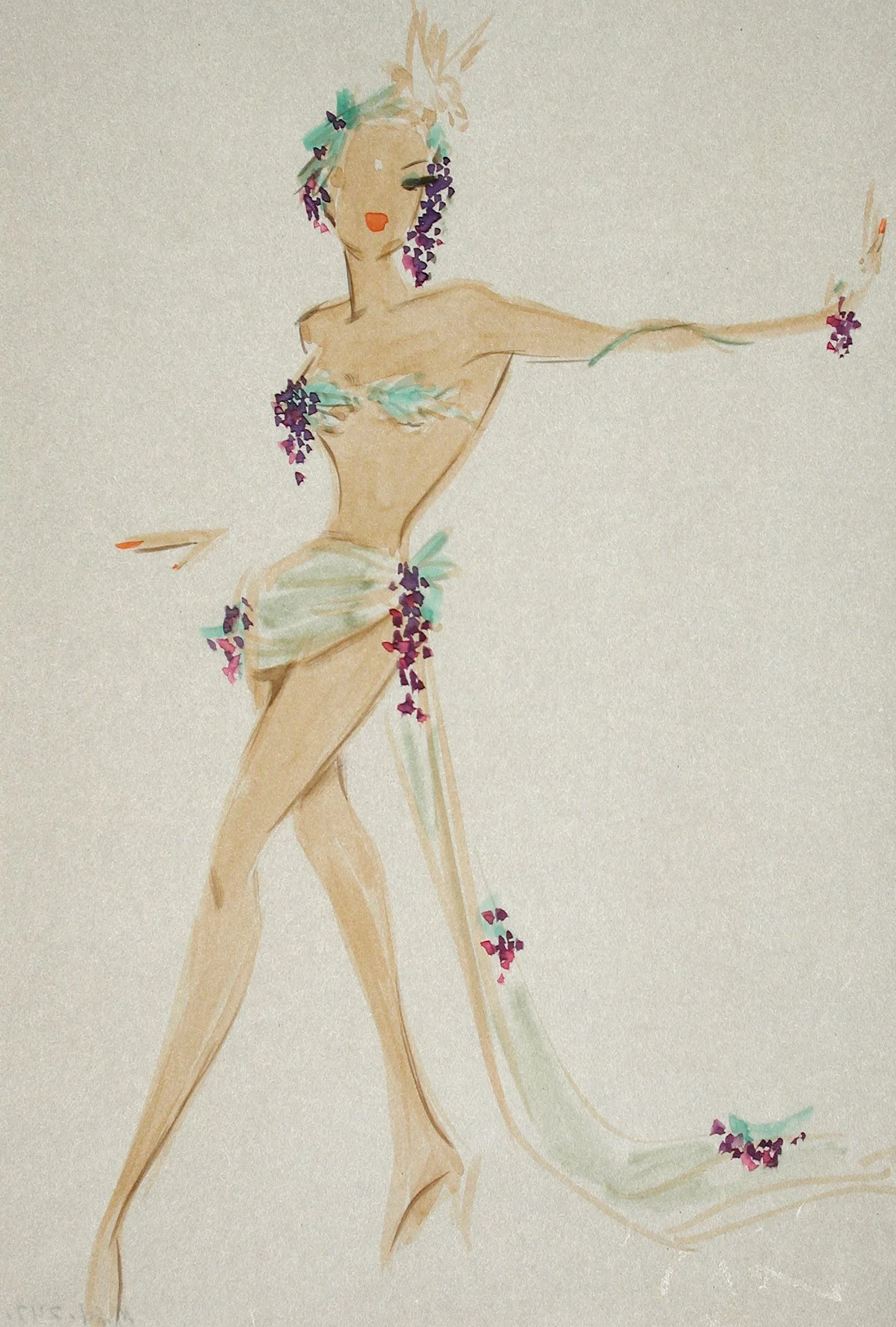 Watercolor and ink drawing on off-white paper, full-length stylized female figure in a grape-and-leaf costume with teal headdress, arms extended, long pale green fabric trailing behind