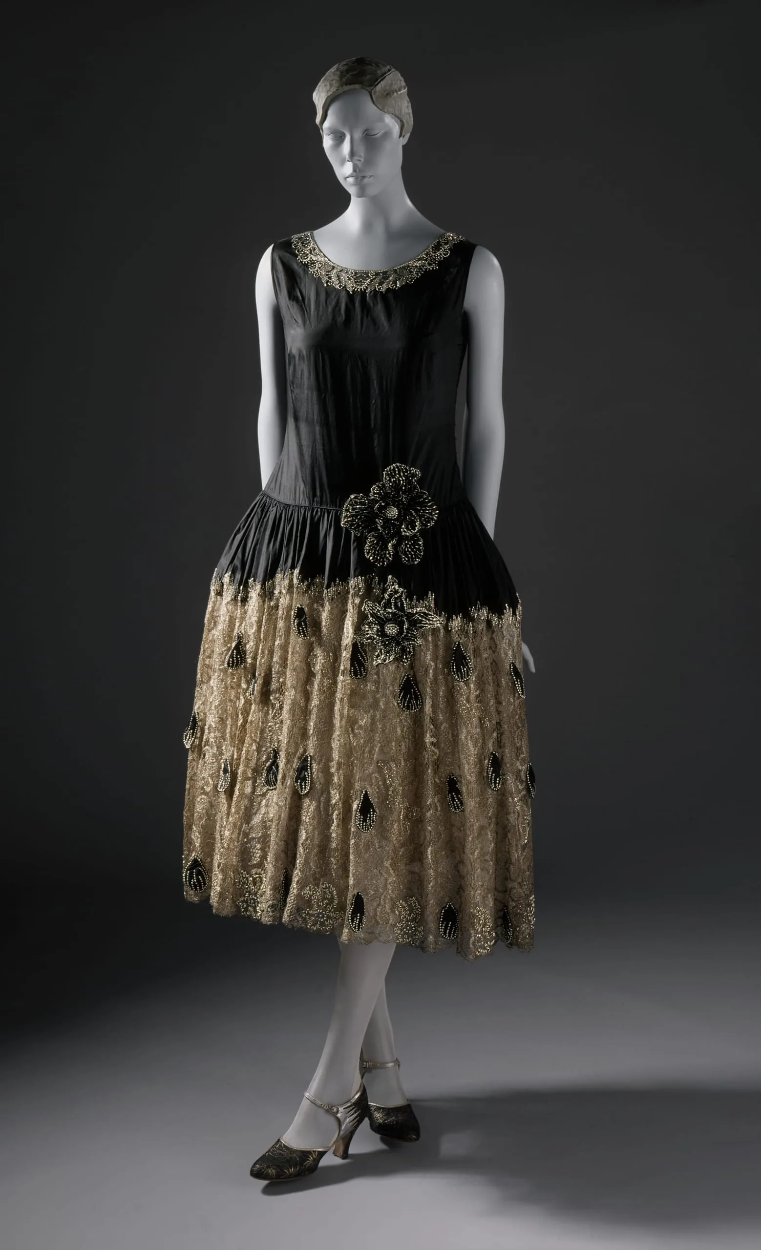 - Silk plain weave (taffeta), metallic lace, silk gauze, with glass bead and crystal embroidery and silk plain weave (taffeta) with metal and plastic bead embroidery