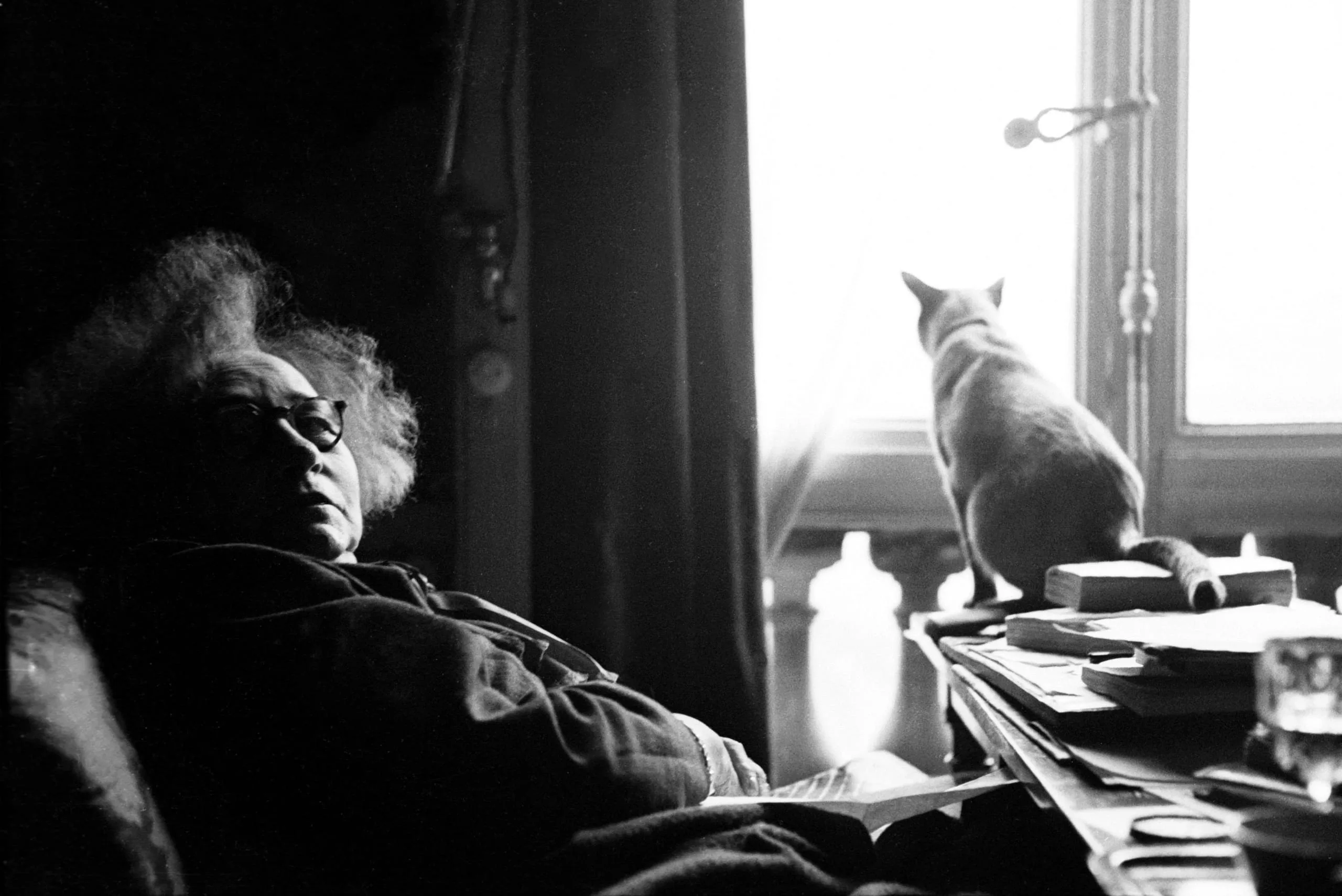 Black and white photograph of a white-skinned person with round glasses and wild gray hair reclining in a chair, with a cat standing on a cluttered desk before a bright window
