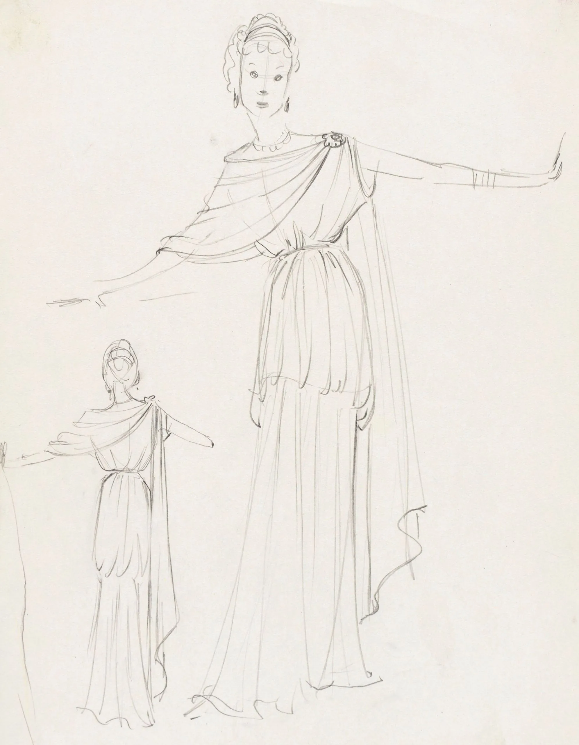Graphite drawing on cream paper of two figures in classical draped robes with arms outstretched, one large and detailed, one small and loosely sketched