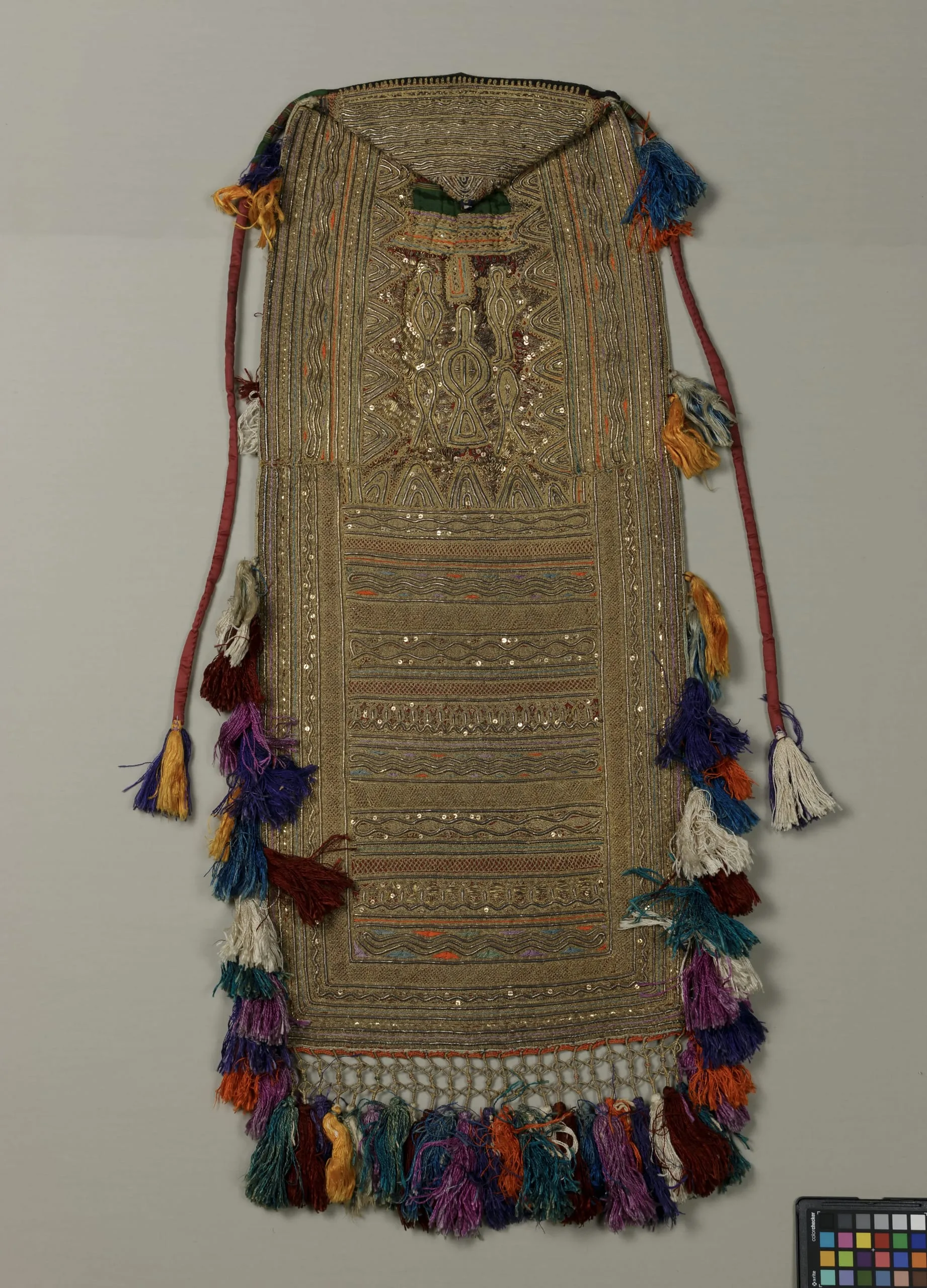 - Silk plain weave with supplementary warp patterning, metallic-thread embroidery, metal sequins, silk fringe, and metal wrapped silk cord
