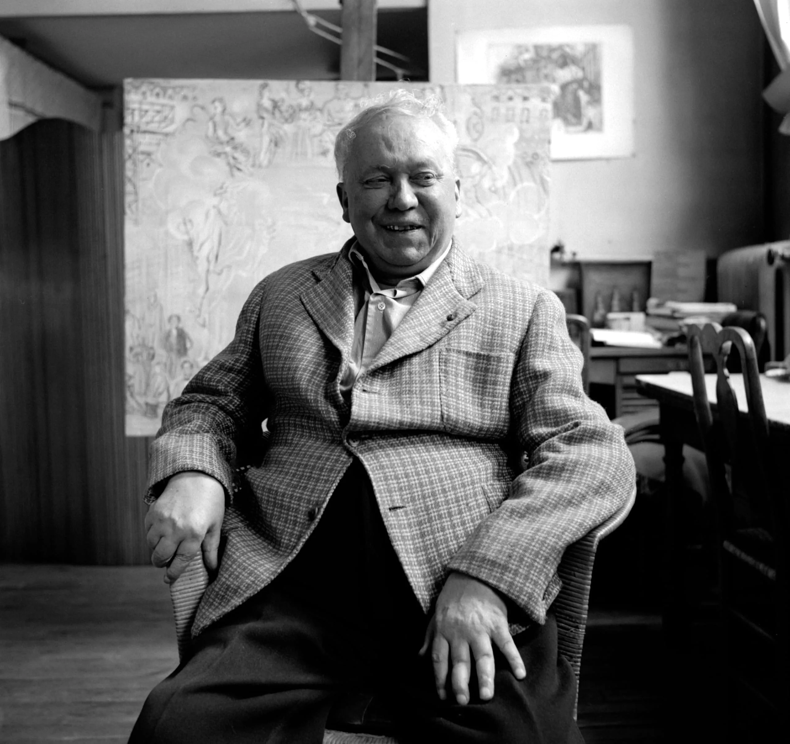 Black and white photograph of a heavyset man in a plaid sport coat seated in a chair, smiling, with a large figure sketch leaning against the wall behind him