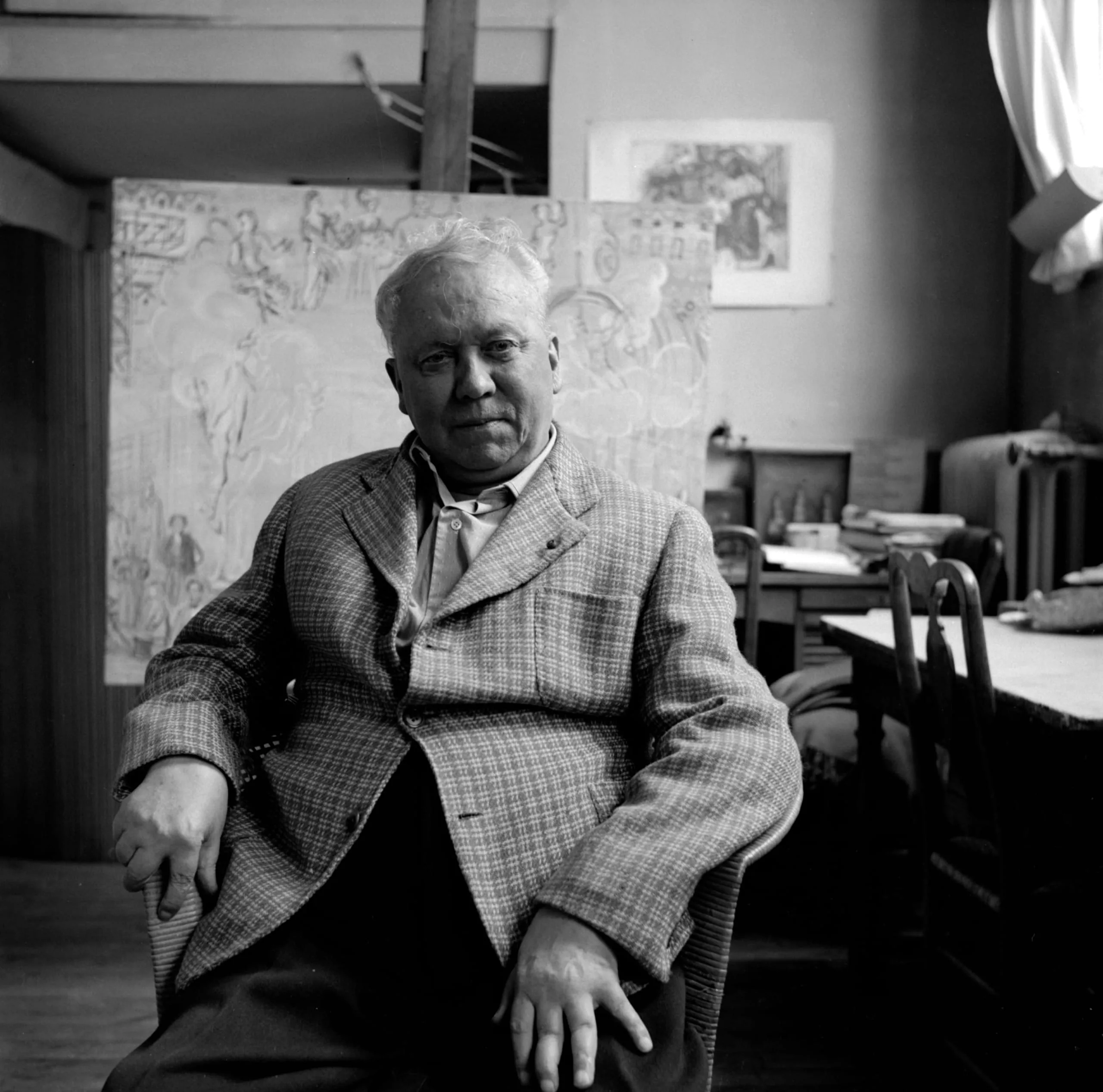 Black and white portrait photograph of a heavyset older man in a plaid jacket seated in a chair, photographed in what appears to be an artist's studio with a large canvas visible behind him