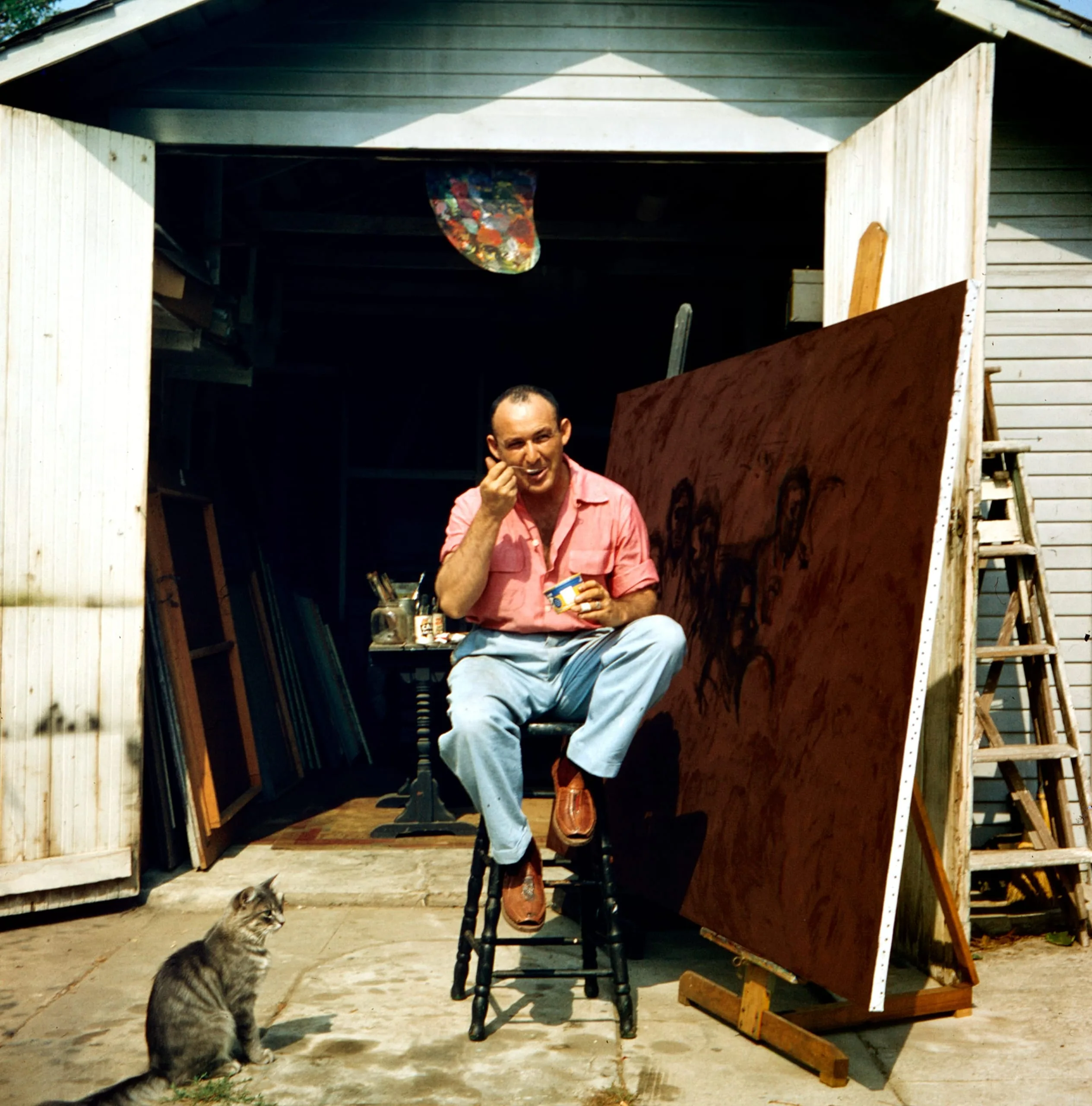 Color photograph of a smiling white man in a pink shirt seated on a stool in a studio doorway, beside a large reddish-brown canvas on an easel, with a cat at his feet