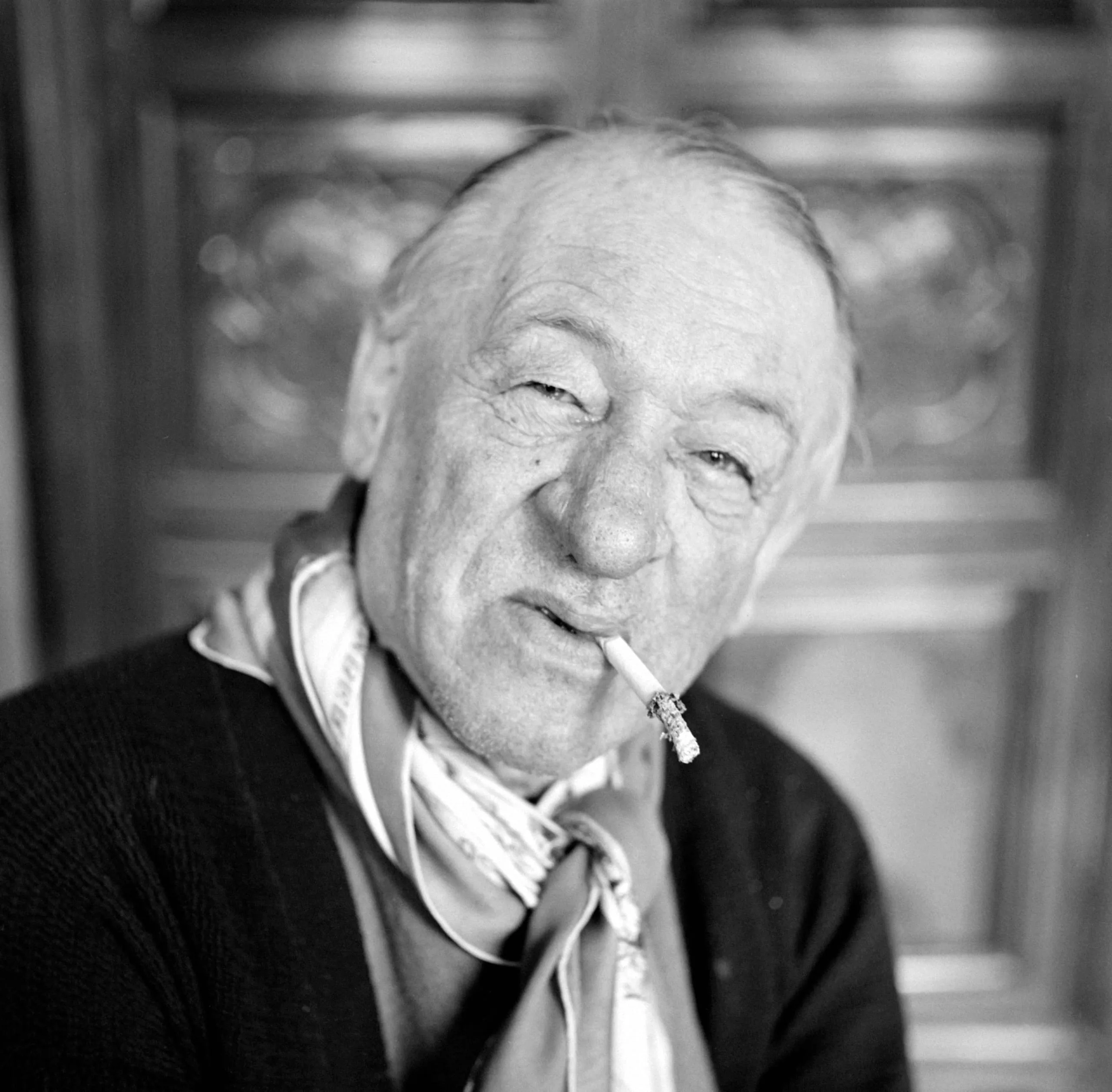 Black and white portrait photograph, older bald man with a cigarette in his mouth, wearing a loosely knotted scarf and dark cardigan, carved wooden panel behind him