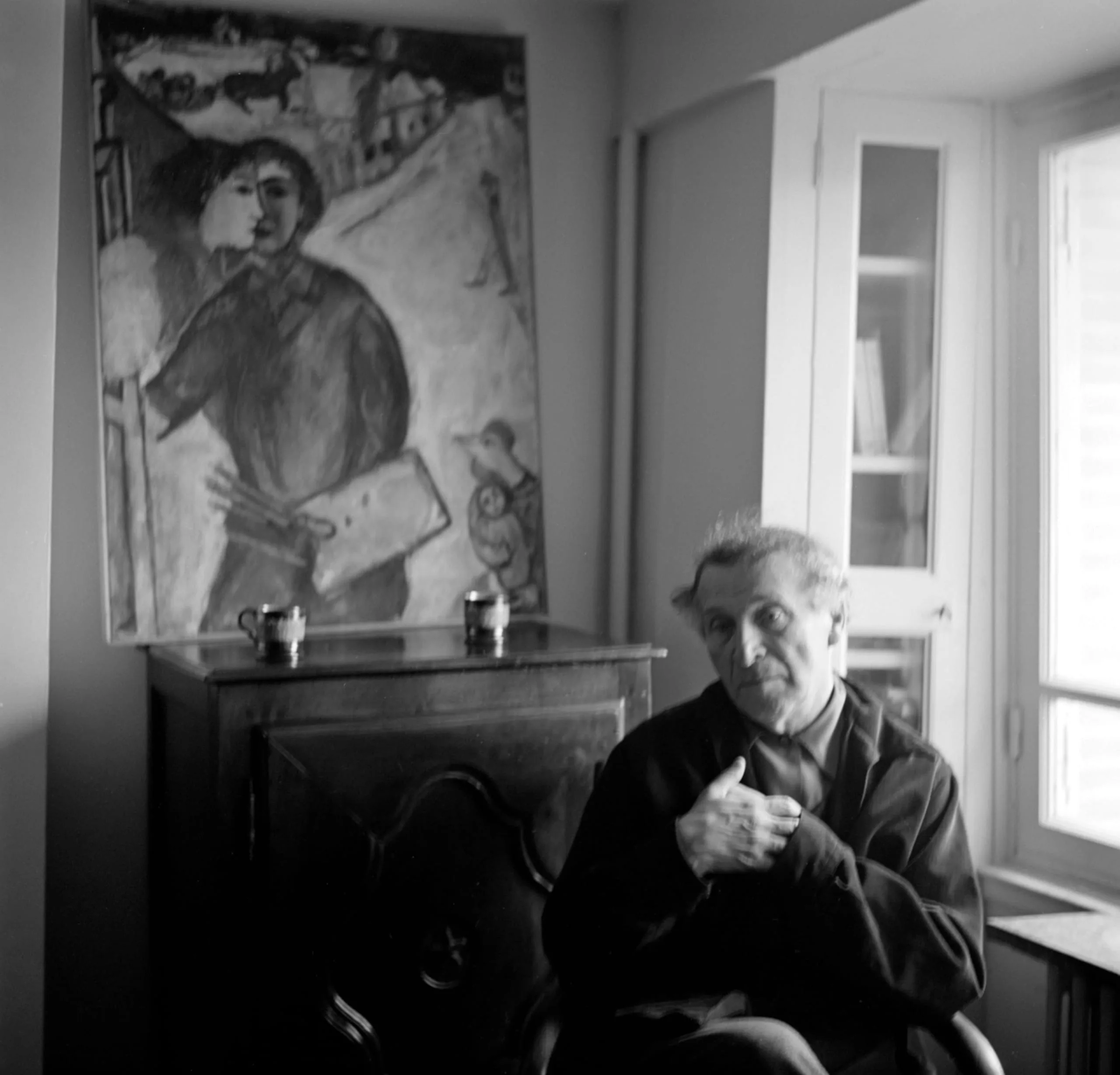 Black and white photograph of an elderly man with white hair seated in a chair, hands clasped at chest, with a large figurative painting hanging on the wall behind him