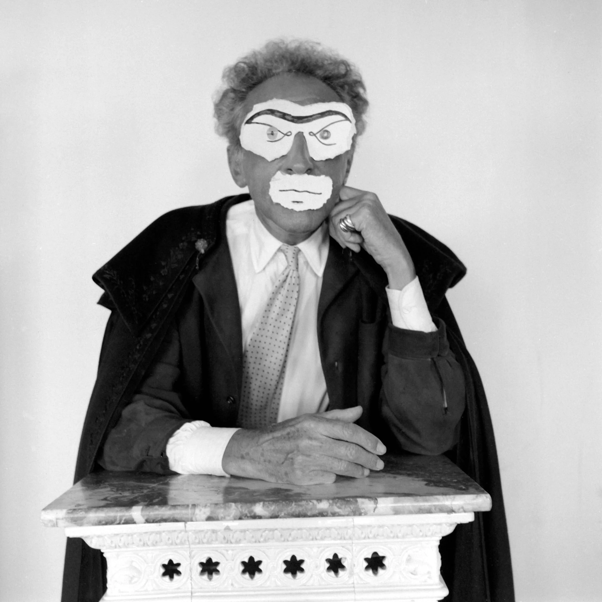 Black and white photograph of a man in a dark cape and suit, wearing a flat illustrated mask with painted brows and beard, seated behind a carved white pedestal
