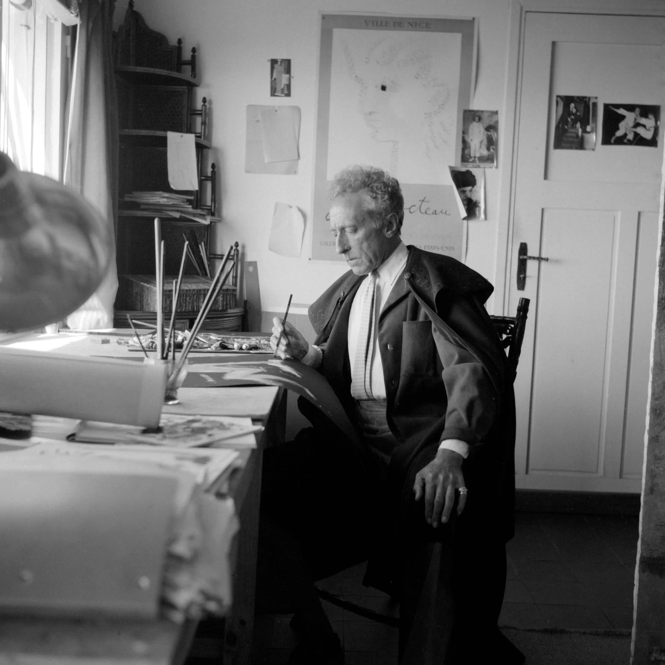 Black and white photograph of an older man seated at a cluttered studio desk, holding a pen or pencil, with papers and a 'Cocteau' sign pinned to the wall behind him