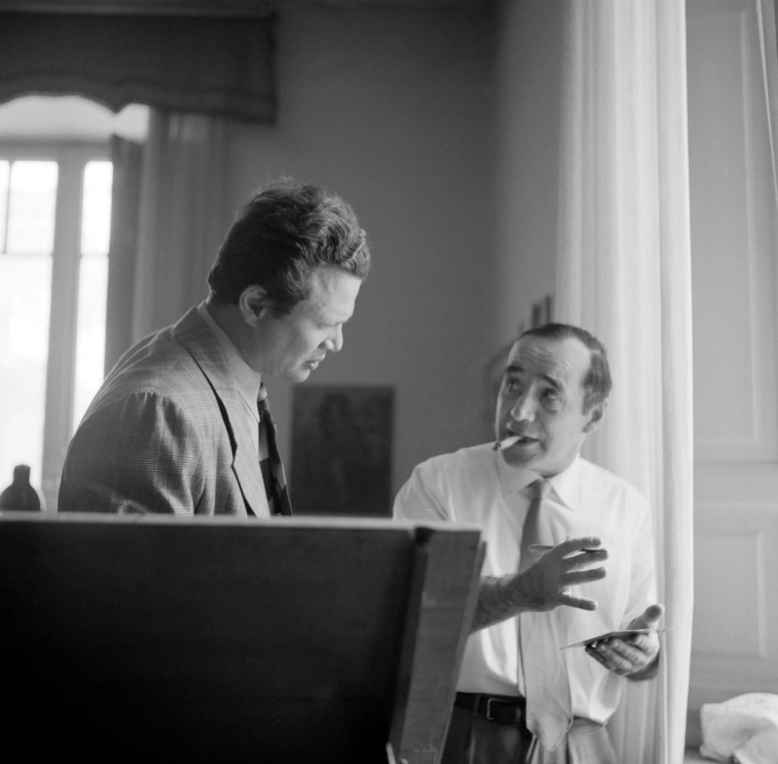 Black and white photograph of two men in conversation indoors, one in a checked jacket listening, the other in a white shirt gesturing with a cigarette