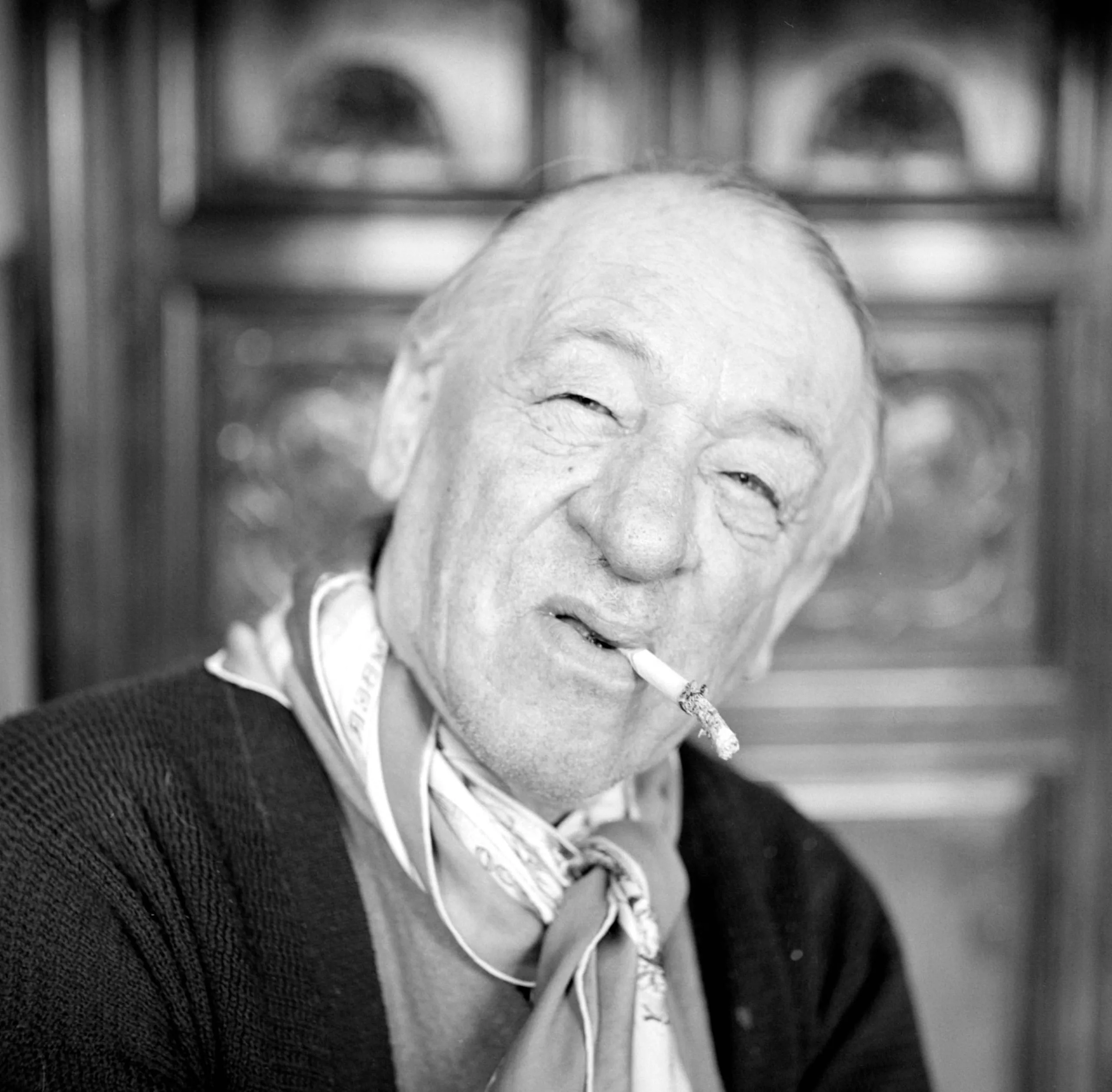 Black and white portrait photograph, older white man with deeply lined face, cigarette at his lips, wearing a dark cardigan and loosely knotted scarf