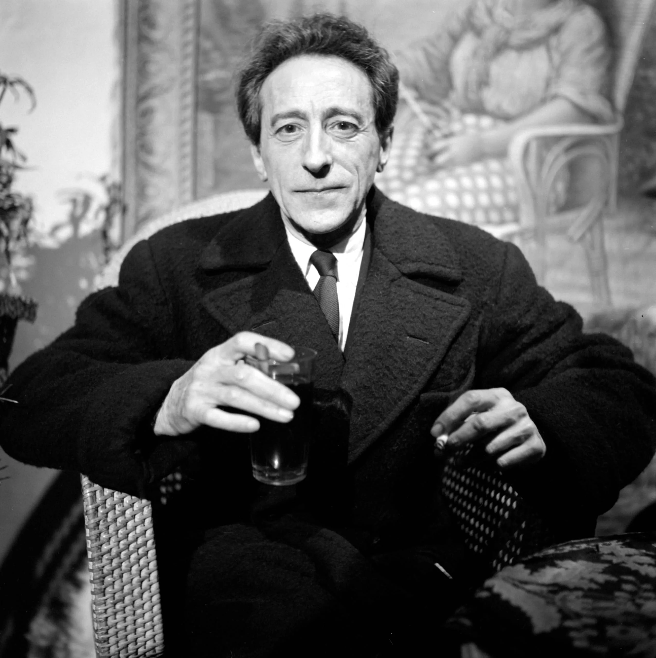 Black and white portrait photograph, white man in a dark overcoat seated in a wicker chair, holding a glass, looking directly at the camera