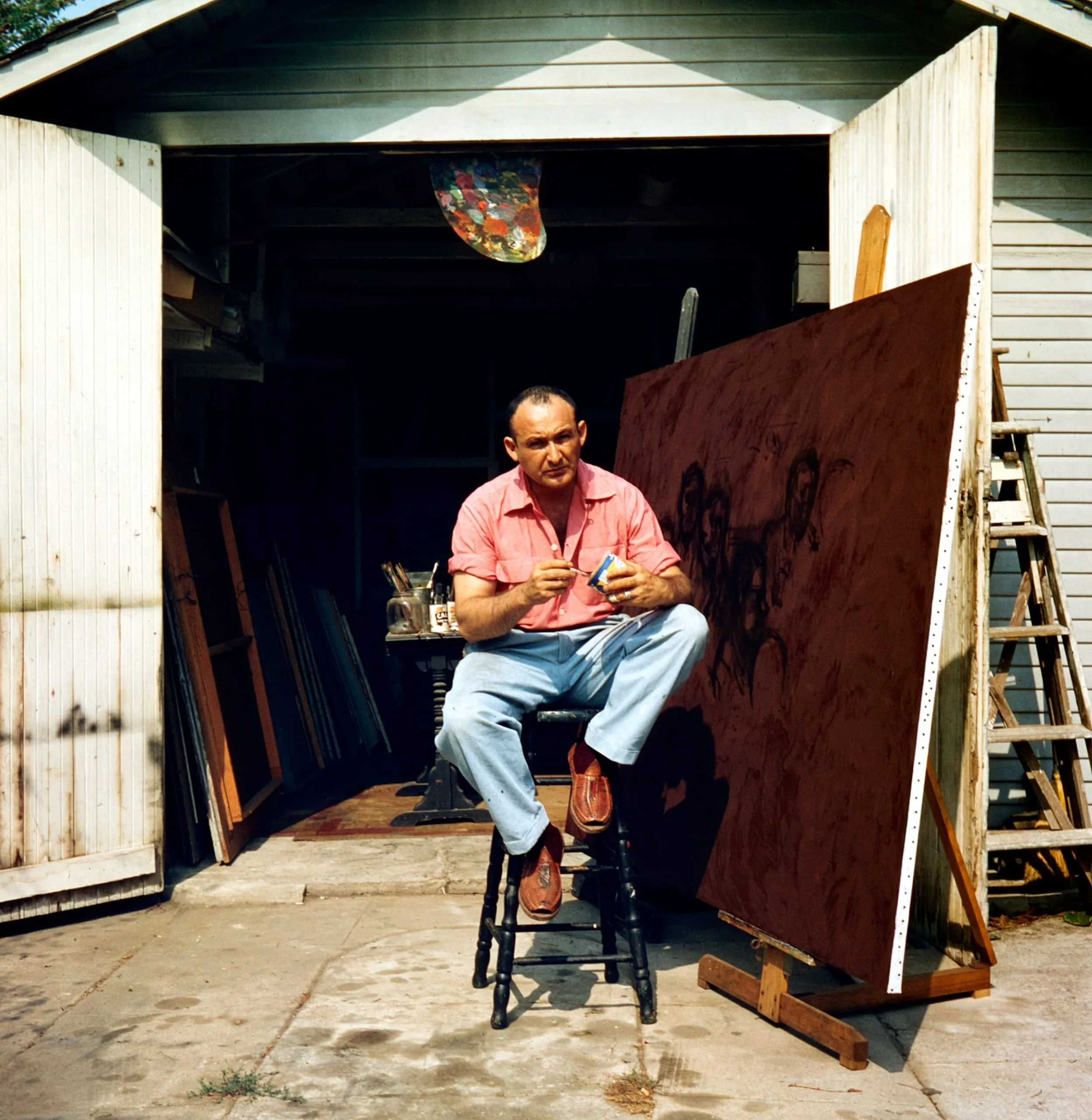 Color photograph of a heavyset white man in a pink shirt and blue trousers seated on a stool before a large rust-red canvas, with art supplies and a palette visible in an open garage behind him