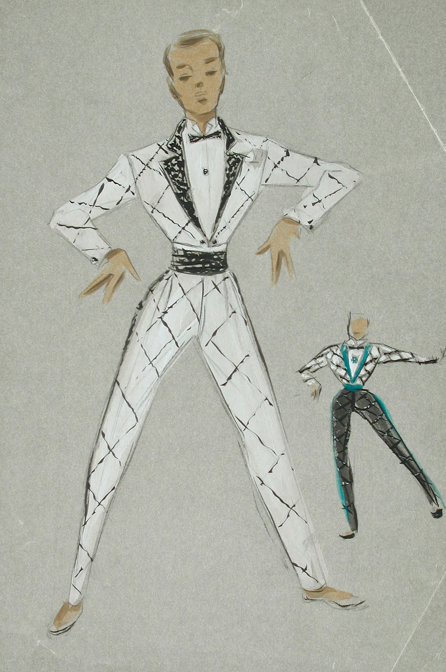 Costume design drawing in ink and gouache on gray paper showing two full-length figures in harlequin-patterned suits, one large in white and black, one small in teal and gray
