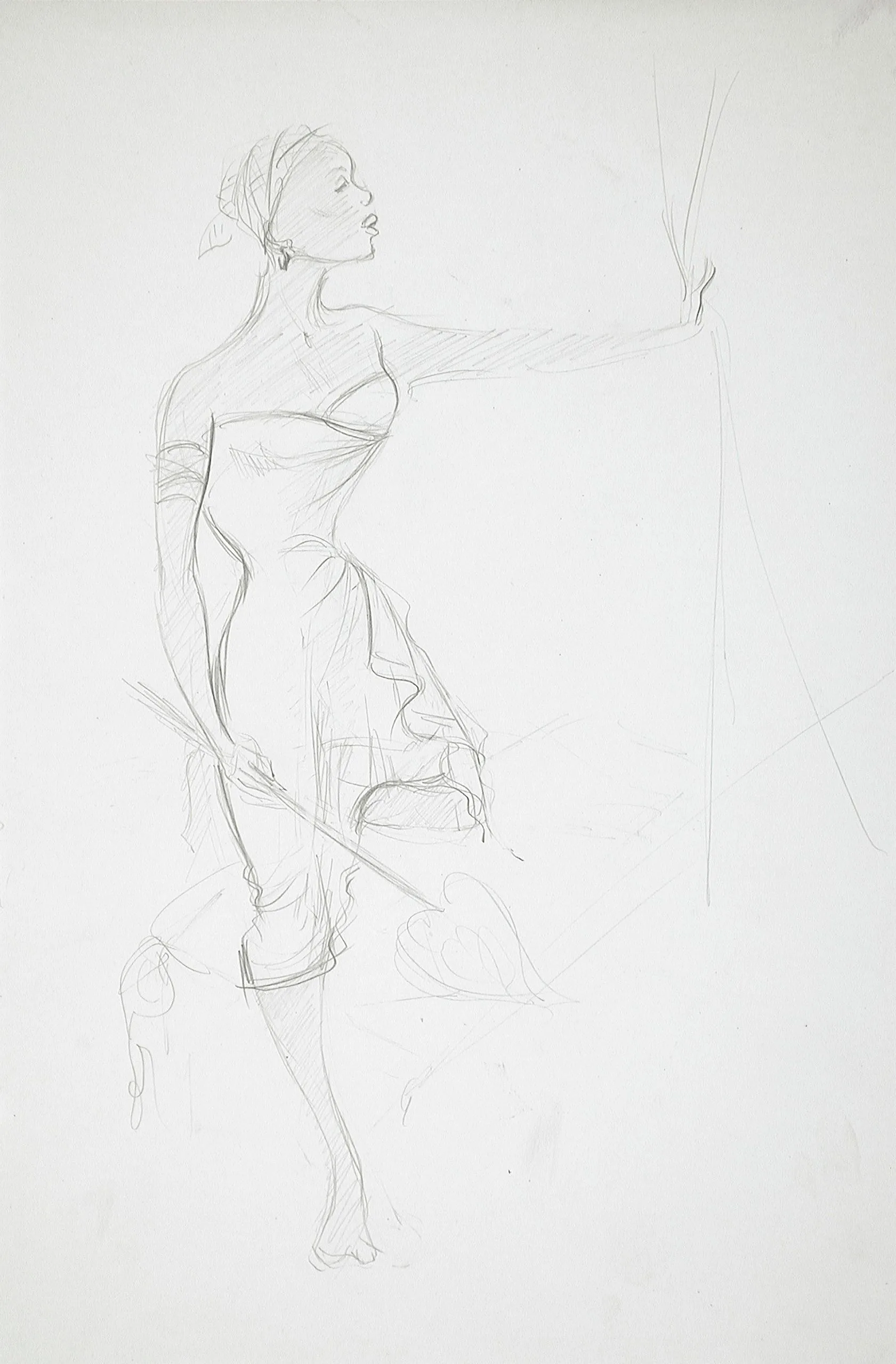 Graphite pencil drawing of a full-length standing woman in profile, arm extended, wearing a ruffled dress, on white paper with loose, gestural lines