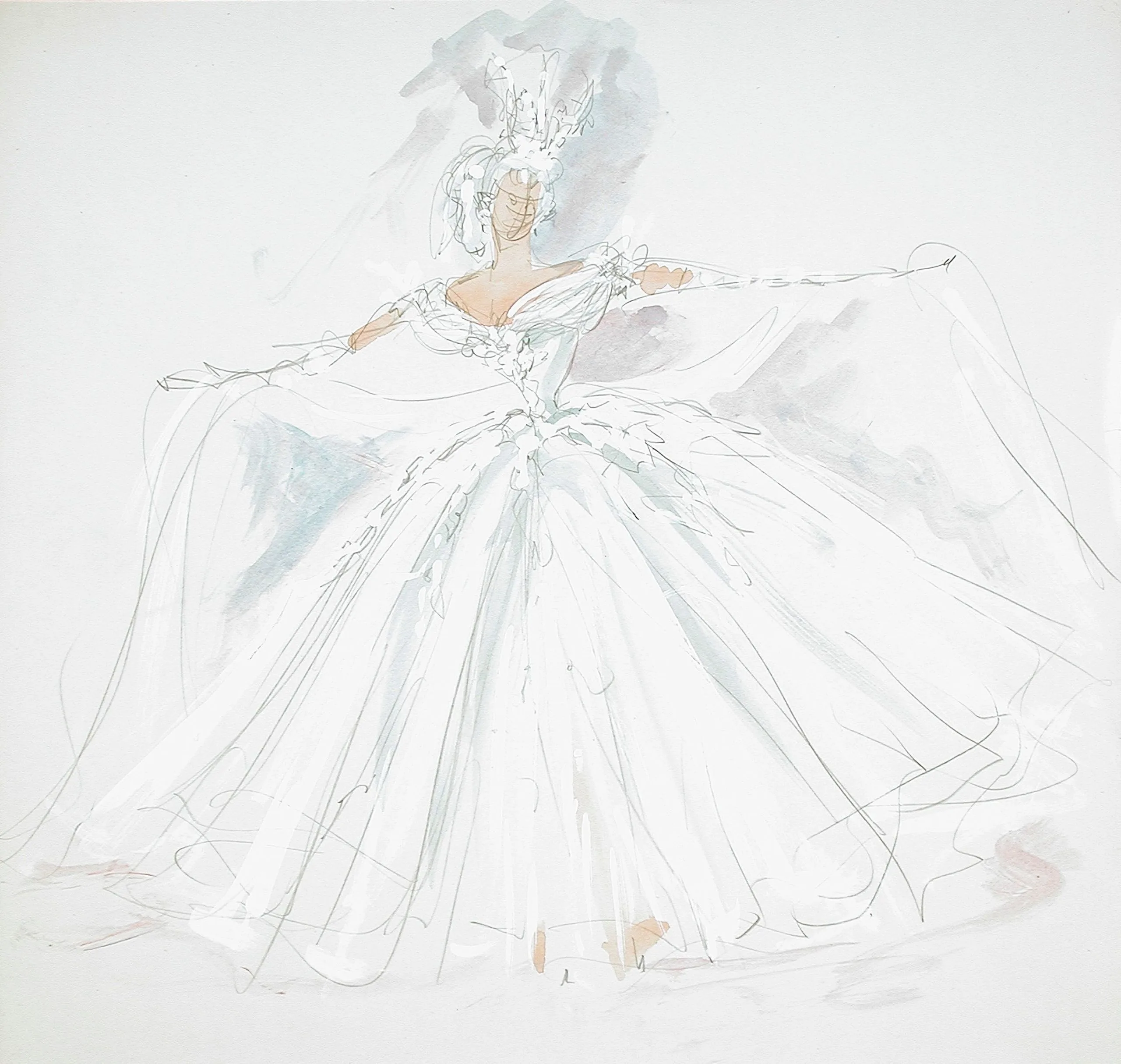 Ink and watercolor costume design drawing of a woman in a full, floor-length white gown with feathered headdress, arms extended, on off-white paper