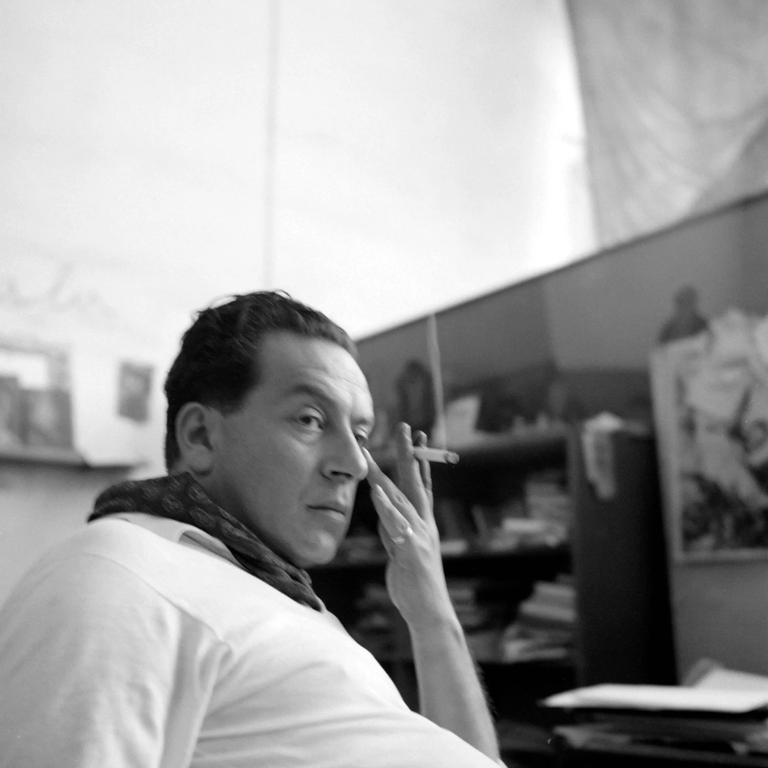 Black and white photograph of a man from the chest up, turning to look over his shoulder, holding a cigarette near his temple, in a cluttered studio setting