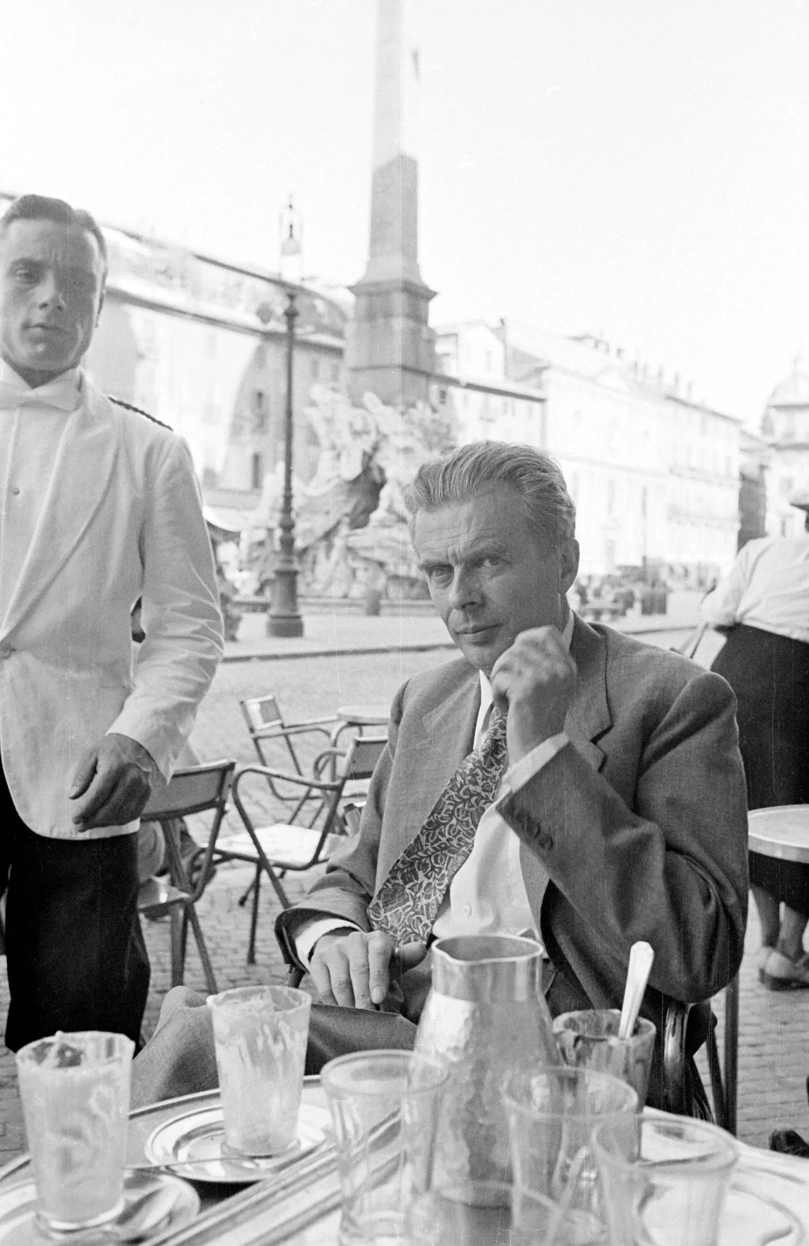 Black and white photograph of a gray-haired man in a sport coat and patterned tie seated at an outdoor café table, a baroque fountain and obelisk visible in the background