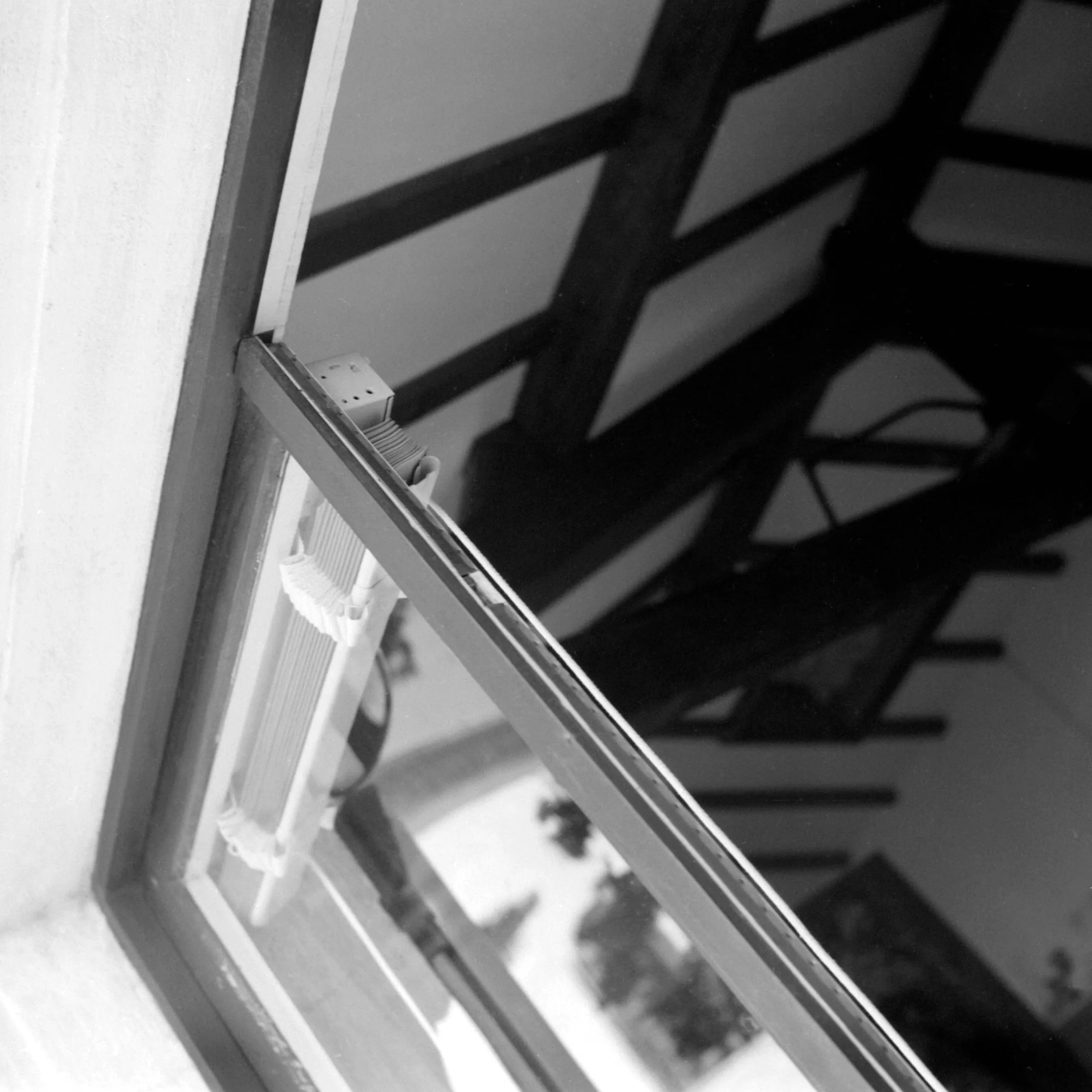 Black and white photograph of a window frame shot on a diagonal angle, with a small latch mechanism mounted on the sash and dark wooden beams visible through the glass