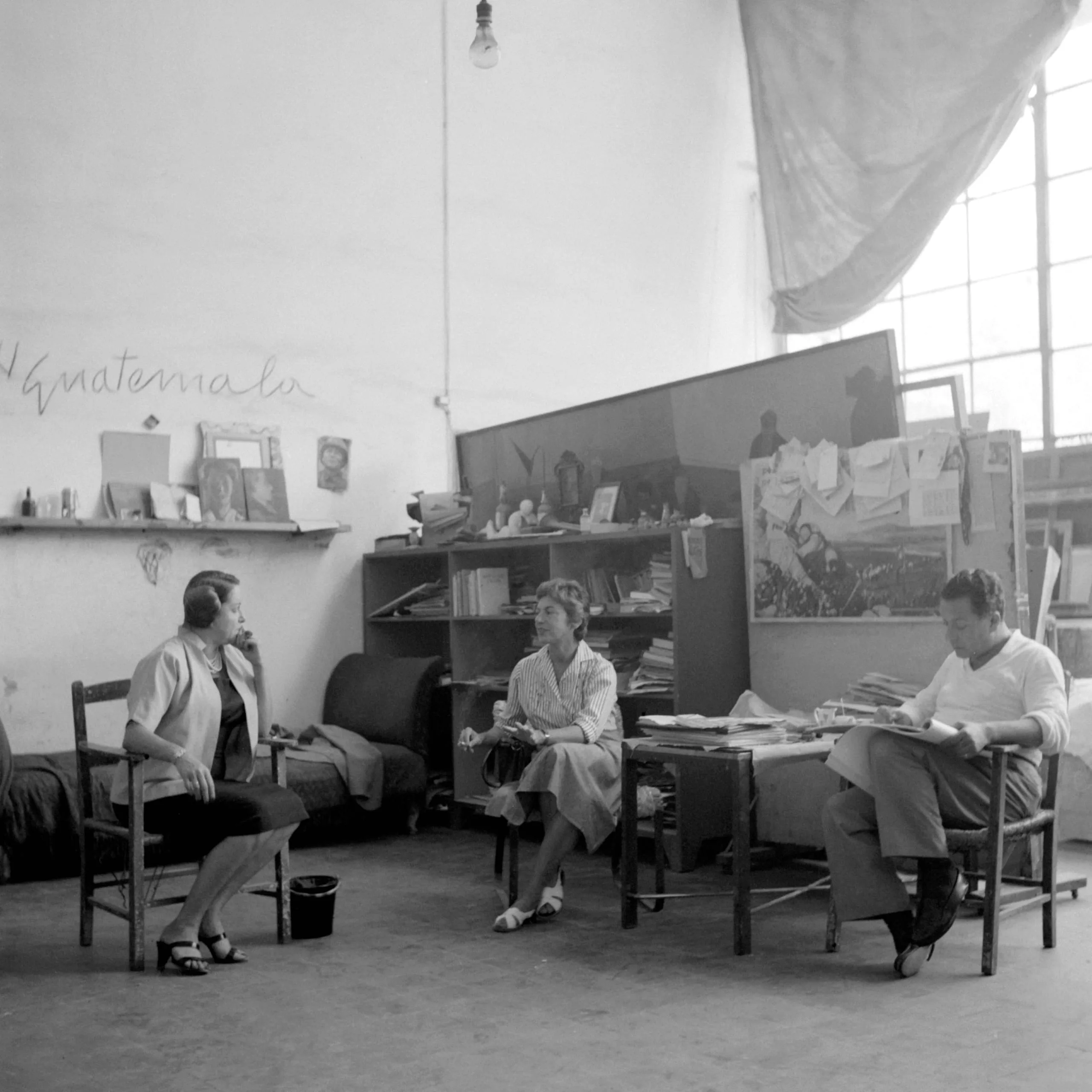 Black and white photograph of three people seated in a cluttered artist's studio, with shelves of art objects and the word 'guatemala' written on the wall